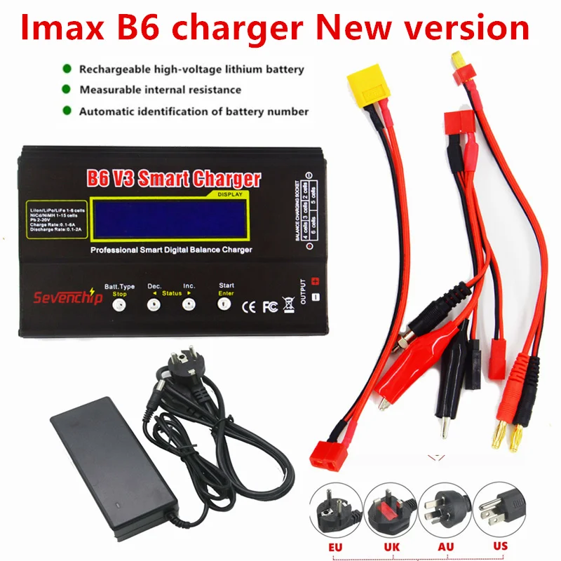 B6 V3-это обновленная версия imax B6, Это цифровое интеллектуальное многофункциональное зарядное устройство, которое поддерживает аккумуляторы LiPo/LiIon/LiFe/NiCd/NiMH PB, аккумулятор высокой мощности LiHV и smart battery I,II,III. Максимальная мощность зарядного устройства 80 Вт, мощность разряда 10 Вт, максимальный ток заряда 6А разрядный ток 2А с высокой эффективностью зарядки.