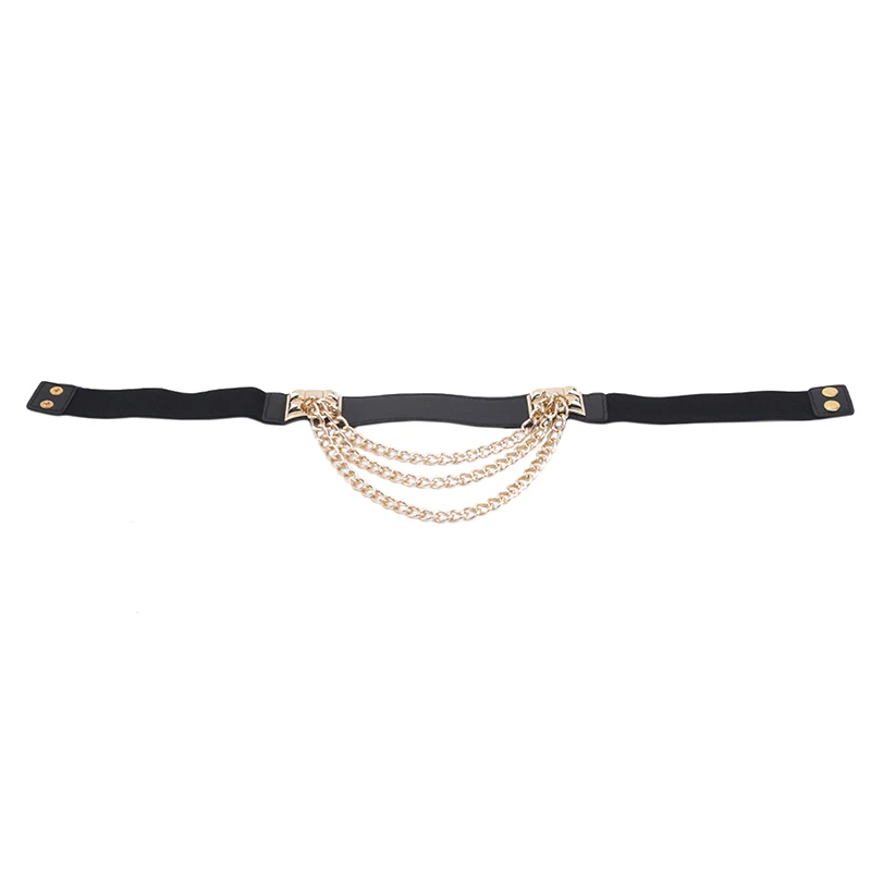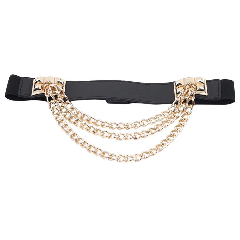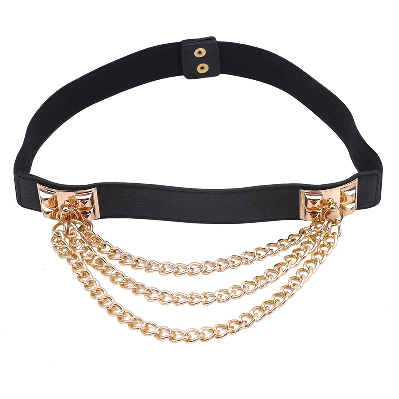 Эластичный пояс для платья для женщин, женский кожаный роскошный пояс в стиле панк, пояс для платья с заклепками и металлической золотой цепочкой