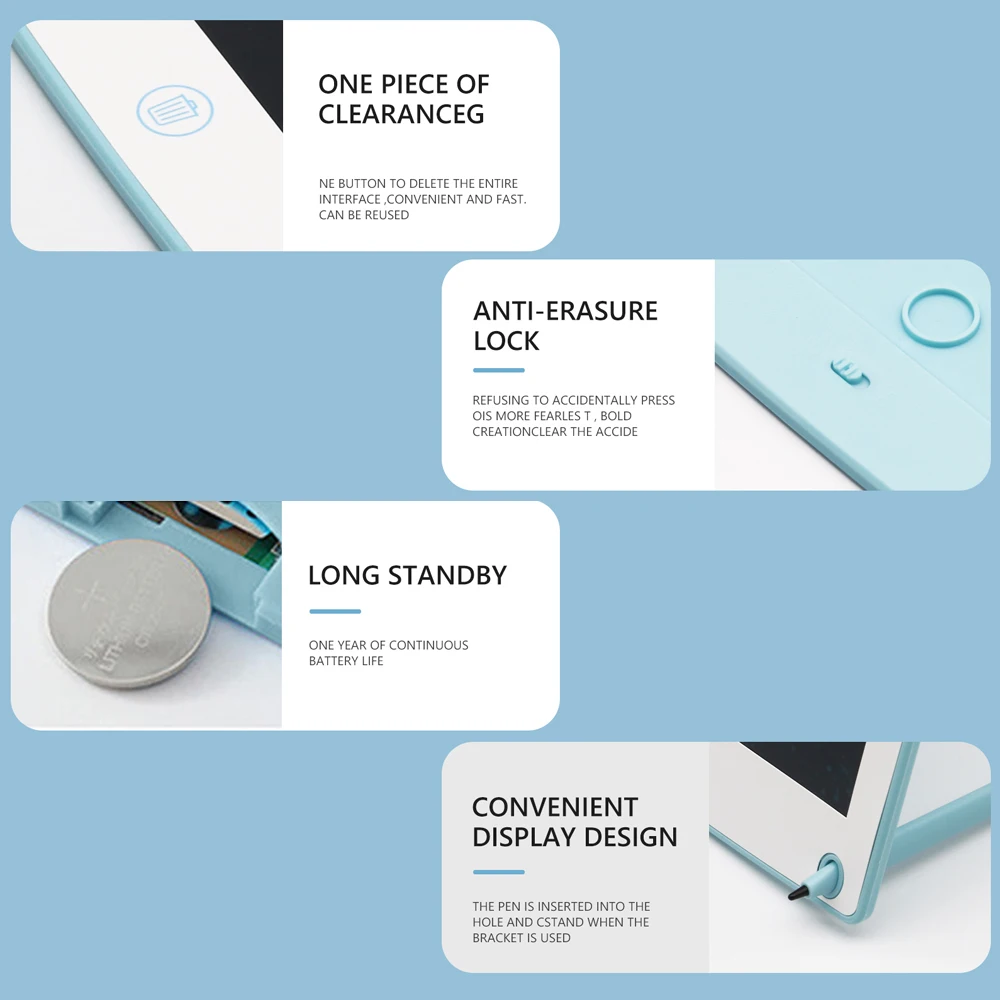1. С ЖК-планшетом для письма дети могут свободно раскрывать свои естественные инстинкты, наслаждаться живописью, счетом чисел, заклинаниями в любое время и в любом месте, не создавая больше беспорядка на земле или стенах 2. Цветной планшет может рисовать графику в разных цветах с хорошими визуальными эффектами и повышать интерес детей к написанию 3. 8,5 дюймов Размер доска для рисования позволит легко быть вынута во всем мире. И планшет сделан из дружественного материала, безопасен для использования в школе и по всему дому, в офисе и автомобиле 4. Это просто как кусок бумаги, который не может быть использован! Планшет для рисования встроен в герметичный кнопочный аккумулятор (сменный), который может работать долгое время с десятками тысяч стираний! 5. Нет подсветки и бликов, все защищают глаза, более безопасные и удобные, когда вы создаете работу в течение длительного времени 6. Подходит для всех возрастов и занятий: таких как деловые мужчины, художники, студенты, преподаватели, дети и дети, также можно использовать дома, в офисе или на пути в любом случае 7. Доска объявлений: Оставьте сообщение вашей семье, и вы можете положить его на стол