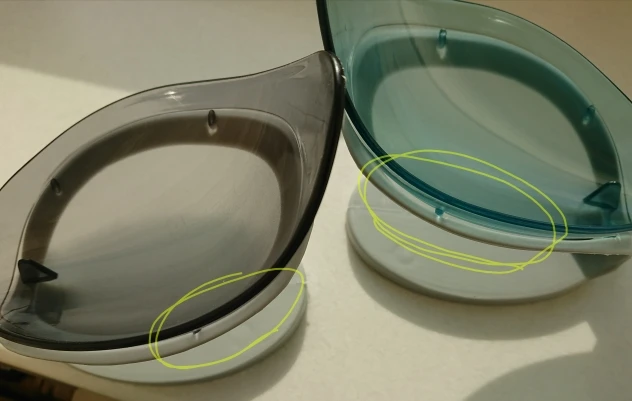 Чаша мыльницы не входит в подставку. Штыри на чаше имеют большее расстояние чем в подставке - см. фото. Усилие для вставки в пазы с натягом не даёт результата. Есть риск, что ободок подствки лопнет. Очевидно литьевые формы платсмассы не соответствуют. Чаша не держится в подствке. Вид не эстетичный - мыльница кривая. Литьевой облой не снят - можно порезать руку.