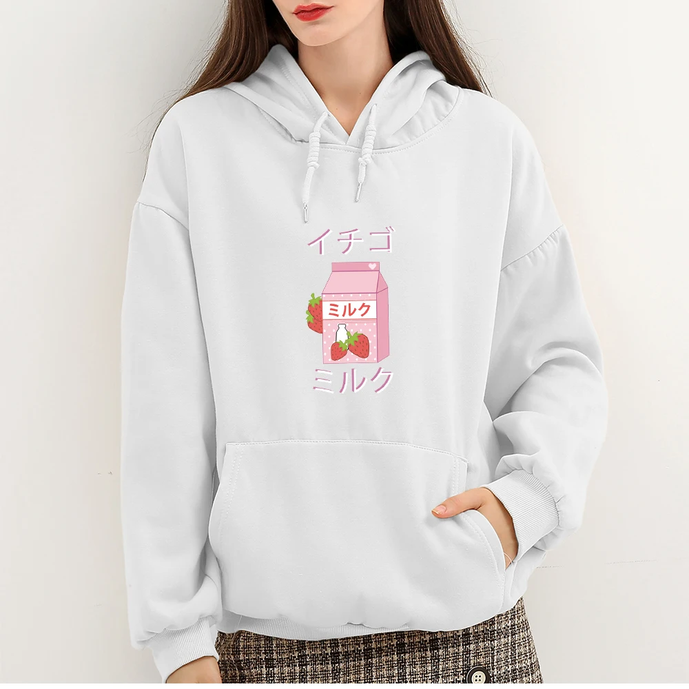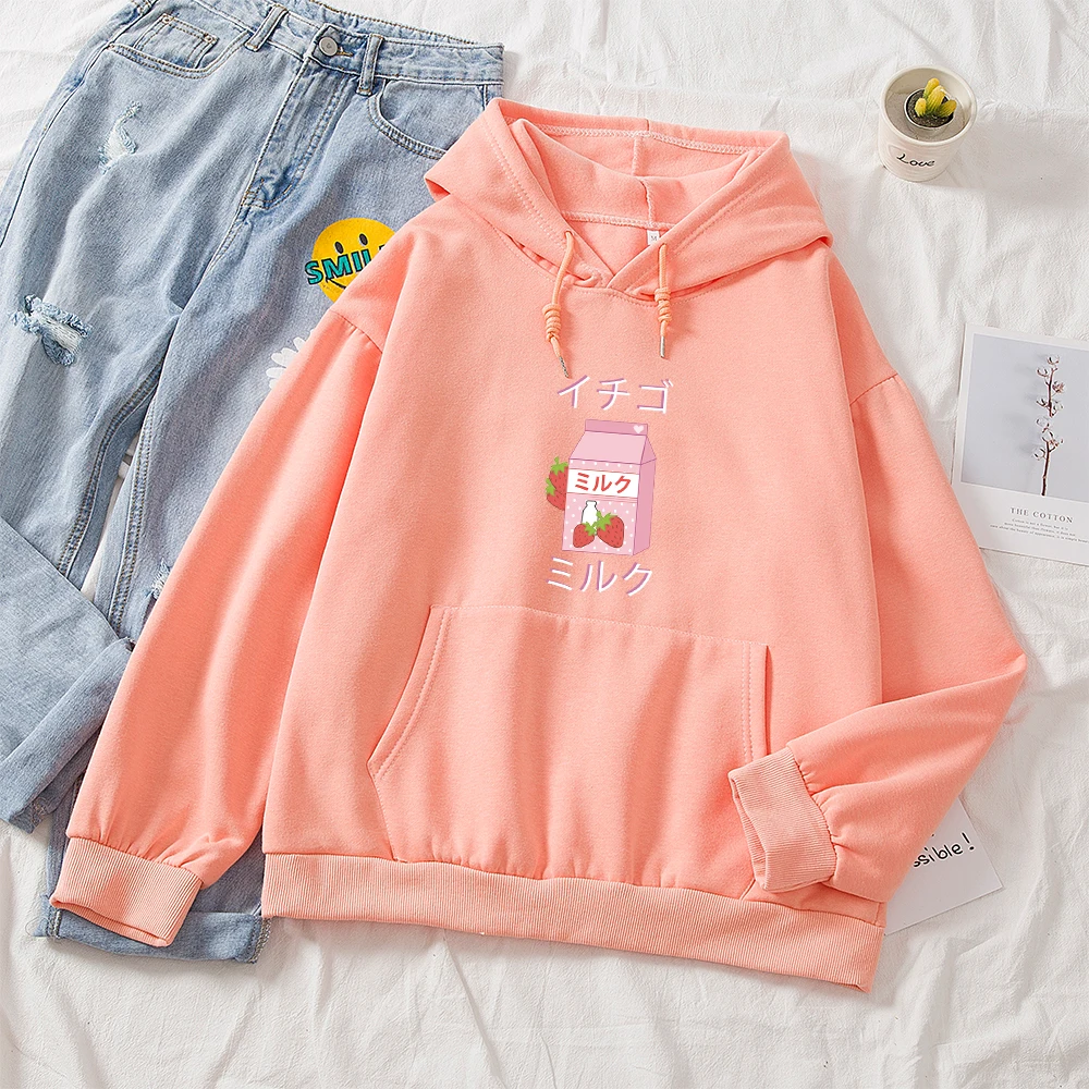 Harajuku Kawaii, клубника, молоко, графический свитшот, толстовки для женщин, уличная одежда зимнего размера плюс, Женская хлопковая толстовка, милая одежда Если вам нравится свободная одежда, рекомендуем выбрать на 1 размер больше.
