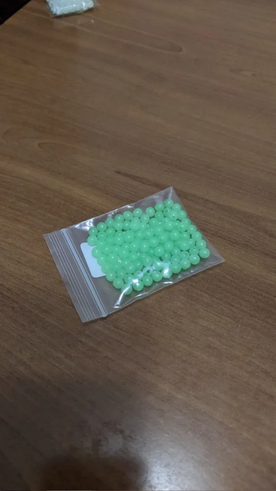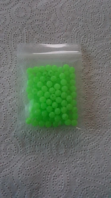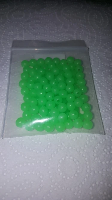 Бусины твёрдые, ста штук, как заявлено нет, мне хватит. Светятся не ярко.