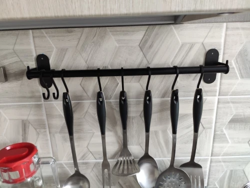 Пришла быстро, сделана из очень тонкого металла, крючки не фиксируются "намертво" на планке, поэтому часто снимаются вместе с приборами. Из-за тонкости металла, немного кривая. Приклеивали на клей (не идёт в комплекте), но в комплекте есть дюбель-гвозди для крепления