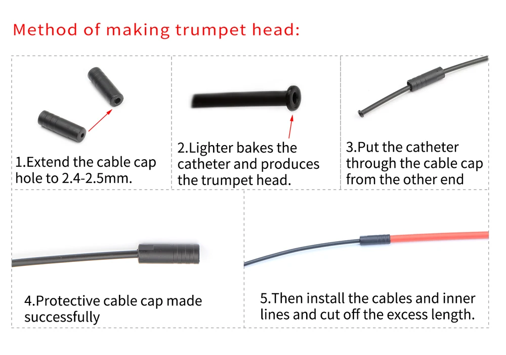 1. Продлить кепки с козырьком, отверстие для 2,4-2,5 мм.2. Зажигалка bakes thecatheter и производитГоловка трубы.3. Поместите катетер через кабельный колпачок с другого конца.4. Защитная крышка кабеля сделана успешно.5. Затем установите кабели и внутренние линии и отрежьте лишнюю Длину.