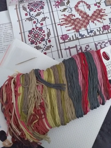 Белая канва 18 каунта, Нитки 15 цветов разобраны на органайзер, имеются номера ниток в DMC. Схема на 4 листах формата А4, достаточно крупная, бумага плотная, матовая. Ключ на отдельном листе. Прилагаются 2 иглы.