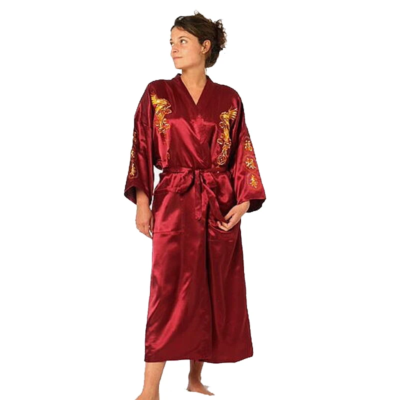 Бордовый атласный халат с вышивкой дракона, кимоно, халат, женское сексуальное ночное белье, большой размер, ночная рубашка, длинный Пижамный костюм из вискозы