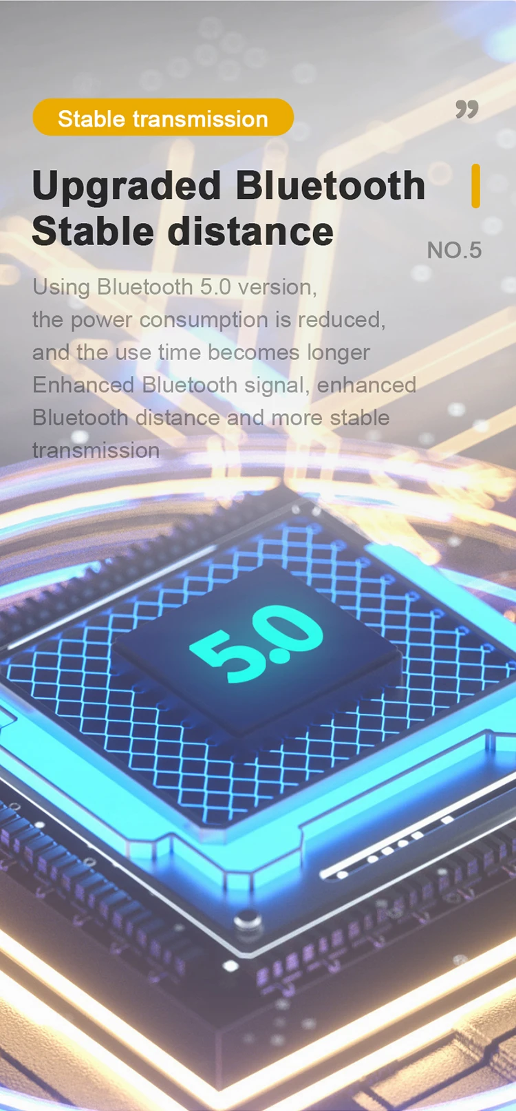 В нем используется чип Bluetooth V5.0, расстояние подключения 10 м, стабильная производительность, высокая передача, низкое потребление энергии и высокая совместимость.