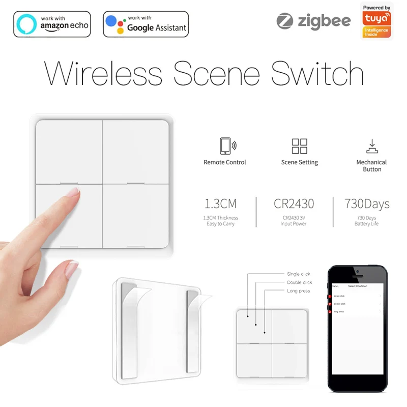 1. Умная Автоматическая Беспроводная сцена Tuya ZigBee переключается на любые умные устройства tuya в приложении Smart Life, чтобы установить различные сцены для вашей умной жизни. Нажмите-to-run, чтобы получить еще один более легкий контроль для всех смарт-устройств tuya с одной клавишей на переключателе. Каждая кнопка переключения может удовлетворить несколько потребностей, Реализуя различные сцены. Вообразите умную связь, чтобы создать бесконечное пространство с проводным переключателем сцены.