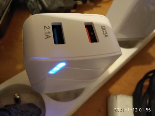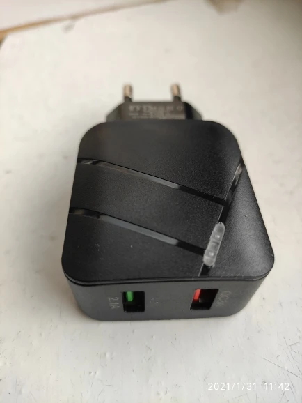 Доставка в МО - 17 дней сборным пакетом с другими заказами. Единственный честный зарядник из заказанных. При полной нагрузке 3А / 2,1А напряжение не просело ниже 5V. Самое удивительное то, что полную нагрузку (18W на QC3.0 и 2,1A на доп. выходе) выдержал даже длительно ( не проверял дольше 30мин), причем одновременно по обеим выходам! Корпус нагрелся примерно до 50С, а вот разъемы - заметно выше 60С. Слабые места: 1. плохой контакт разъемов; 2. при QC3.0 зарядке выбивает помехами другие зарядники в той же розетке (кратковременно, раз в несколько секунд, как свой доп. канал, или полностью блокируя работу); 3. очень высокий уровень пульсаций на выходе (см. фото при 2А), особенно в доп. канале. Несмотря на все недостатки, снижать оценку не стал, поскольку реальной альтернативы не нашел.