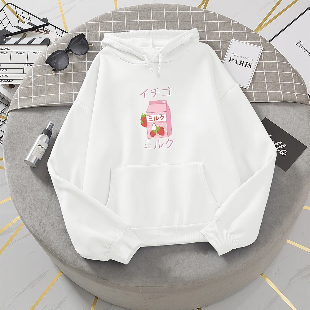 Симпатичная теплая толстовка с капюшоном в виде клубники в стиле Харадзюку худи с графическим принтом клубники и молока женская зимняя уличная одежда для школьниц
