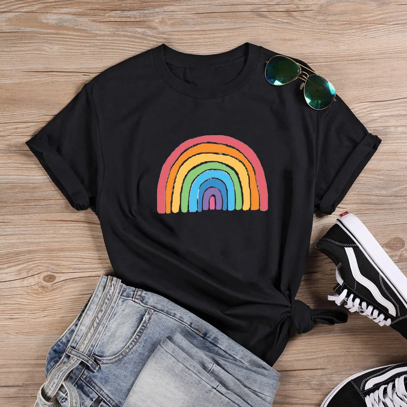 Футболка женская с радужным графическим принтом, хлопковая тенниска с коротким рукавом, свободная майка в стиле Харадзюку, черный белый цвет