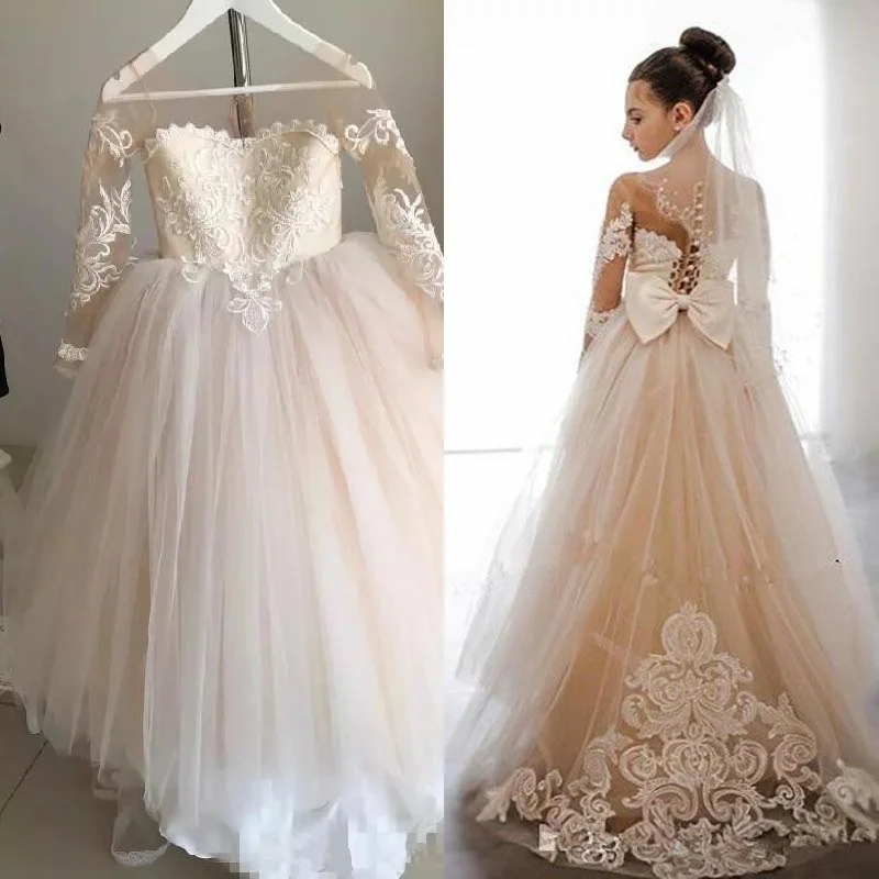 Детское Пышное кружевное бальное платье с длинными рукавами; Платья с цветочным узором для девочек; Пляжная одежда принцессы для свадьбы; Детская одежда с отвесным вырезом; Пышная одежда для малышей