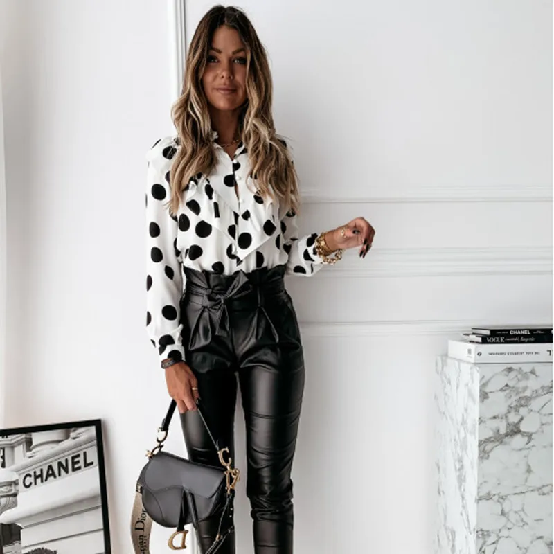 Женская Повседневная рубашка в горошек с оборками, офисная блузка на пуговицах с v-образным вырезом и длинным рукавом, Новинка осени 2020, элегантные пуловеры, Топ