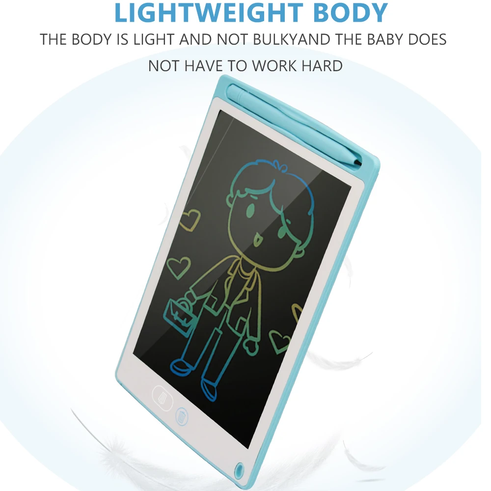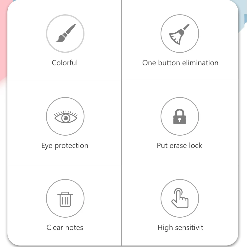 1. Цветной планшет может рисовать графику в разных цветах с хорошими визуальными эффектами и повышать интерес детей к написанию 2. С ЖК-планшетом для письма дети могут свободно раскрывать свои естественные инстинкты, наслаждаться живописью, счетом чисел, заклинаниями в любое время и в любом месте, не создавая больше беспорядка на земле или стенах 3. Это просто как кусок бумаги, который не может быть использован! Планшет для рисования встроен в герметичный кнопочный аккумулятор (сменный), который может работать долгое время с десятками тысяч стираний! 4. 8,5 дюймов Размер доска для рисования позволит легко быть вынута во всем мире. И планшет сделан из дружественного материала, безопасен для использования в школе и по всему дому, в офисе и автомобиле 5. Подходит для всех возрастов и занятий: таких как деловые мужчины, художники, студенты, преподаватели, дети и дети, также можно использовать дома, в офисе или на пути в любом случае 6. Нет подсветки и бликов, все защищают глаза, более безопасные и удобные, когда вы создаете работу в течение длительного времени 7. Доска объявлений: Оставьте сообщение вашей семье, и вы можете положить его на стол
