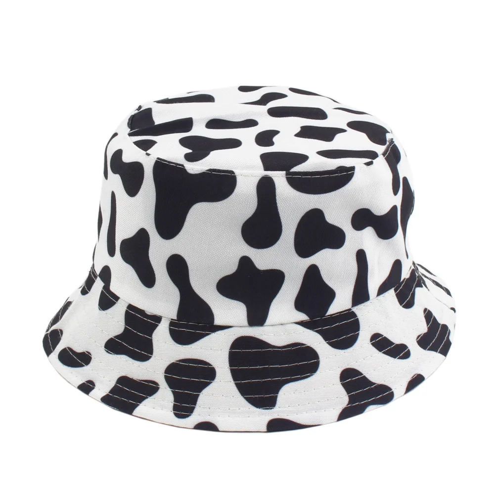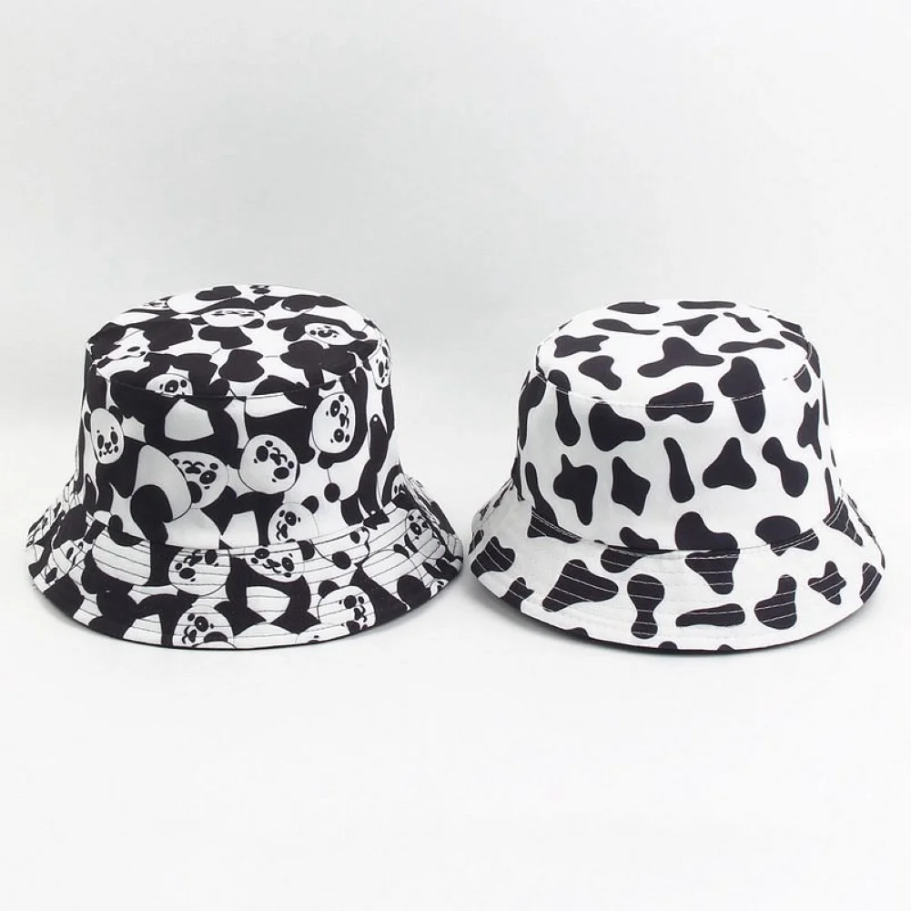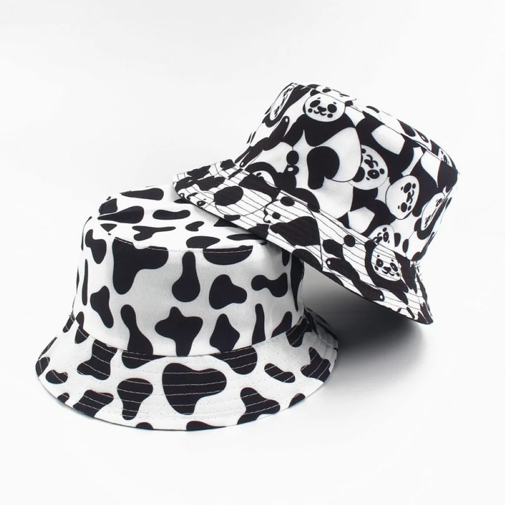 Для женщин одежда с принтом милой коровы; Детские носки с принтом с пандой открытый двусторонний Реверсивные ведро Кепки шляпа от солнца