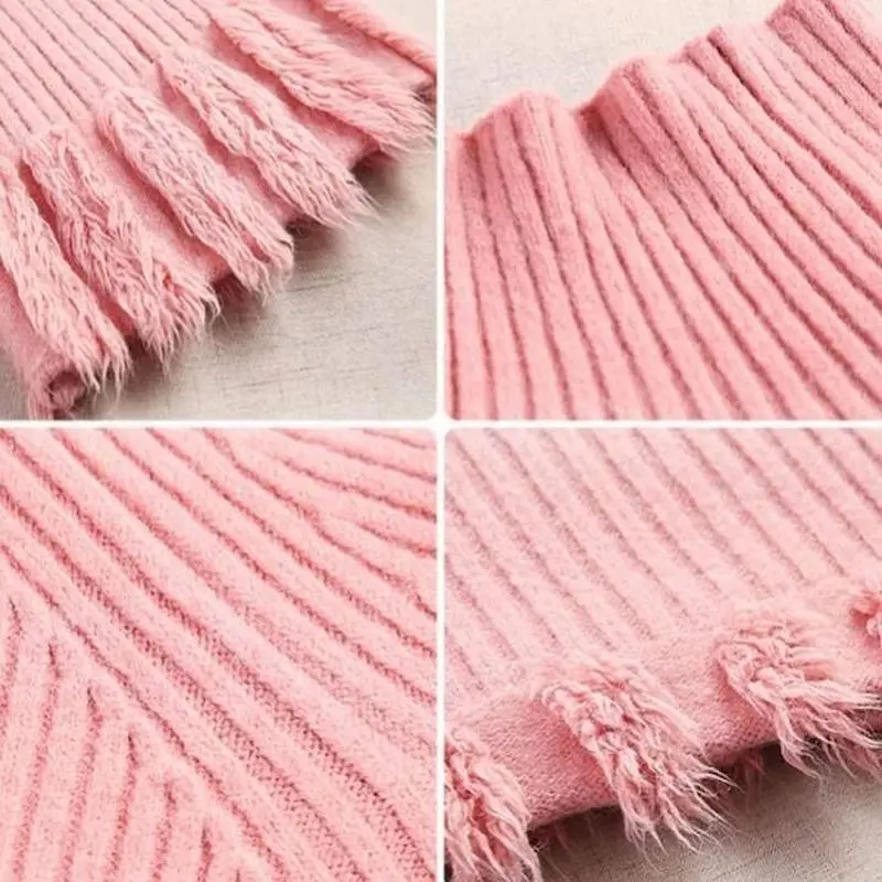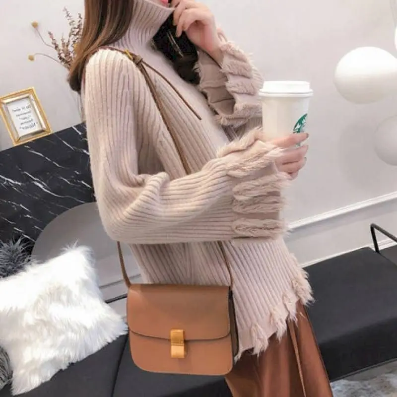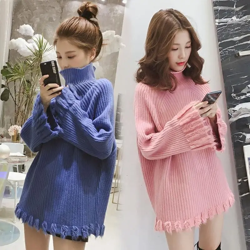 Женский свитер, модная теплая и милая блузка, Свободный вязаный свитер розового цвета с подкладкой, высоким воротником и бахромой
