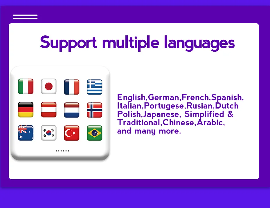 Русский, английский, испанский, итальянский, французский, чешский, арабский, немецкий, иврит, китайский, эстонский, польский, филиппинский, финский, корейский, голландский, хорватский, латышский,