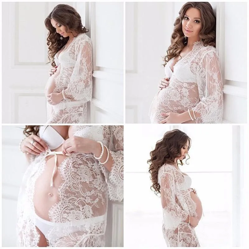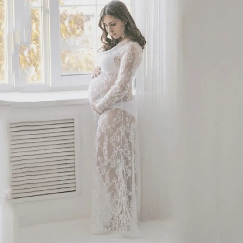 Кружевное длинное платье для беременных женщин с длинным рукавом и разрезом спереди