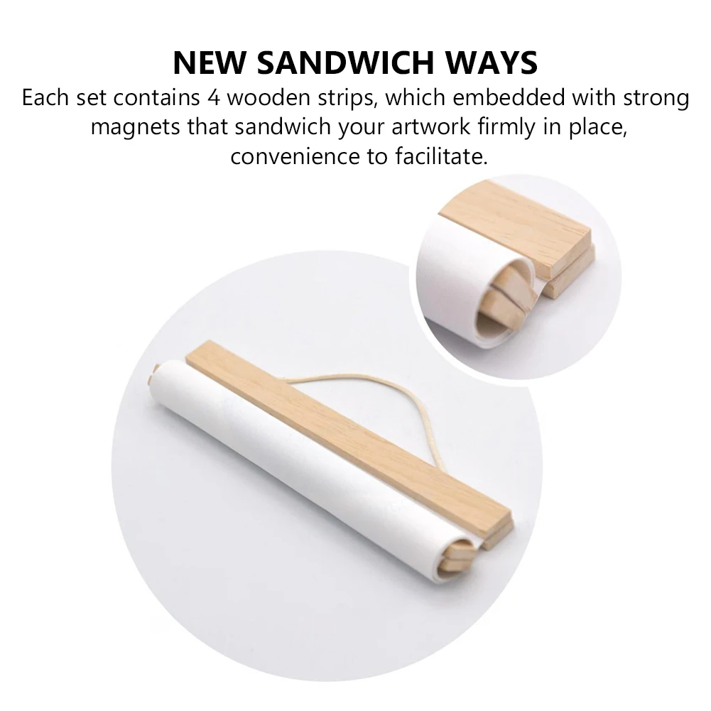 Каждый набор состоит из 4 деревянных полосок, встроенных в них сильными магнитами, которые надежно сдвигают ваши рисунки.