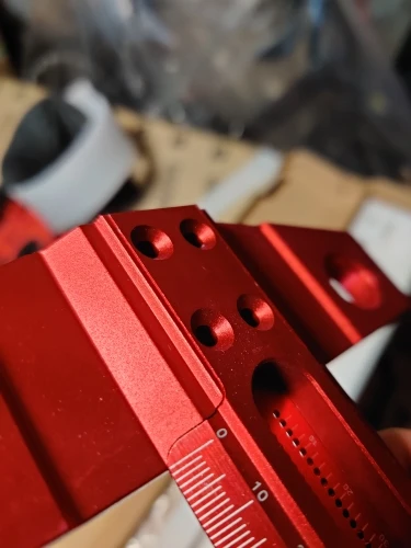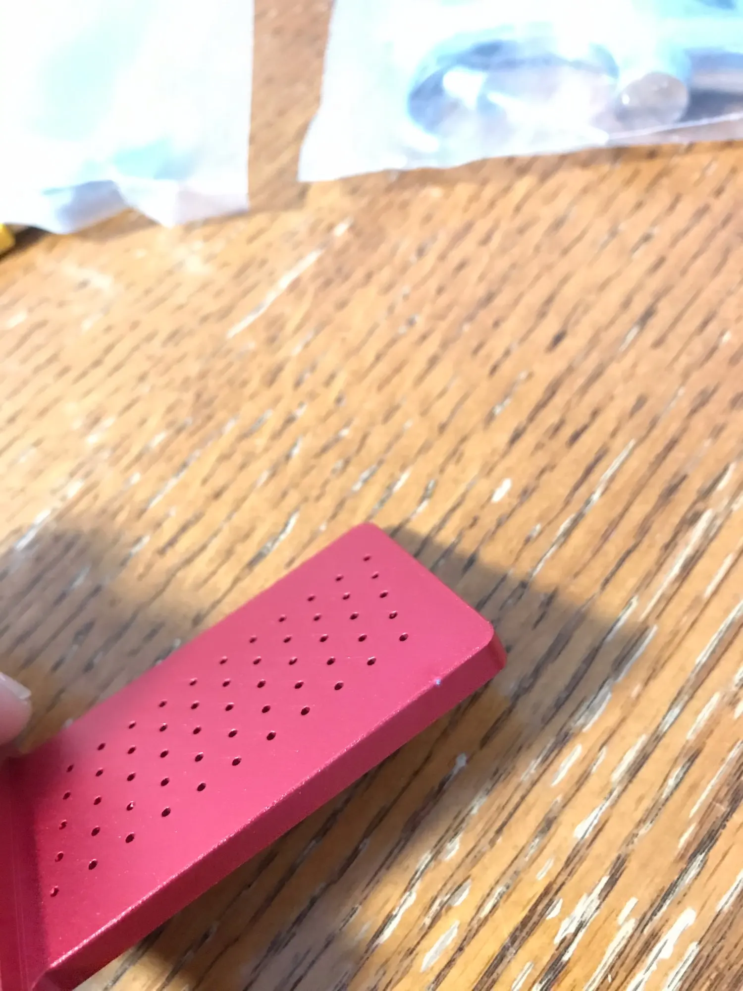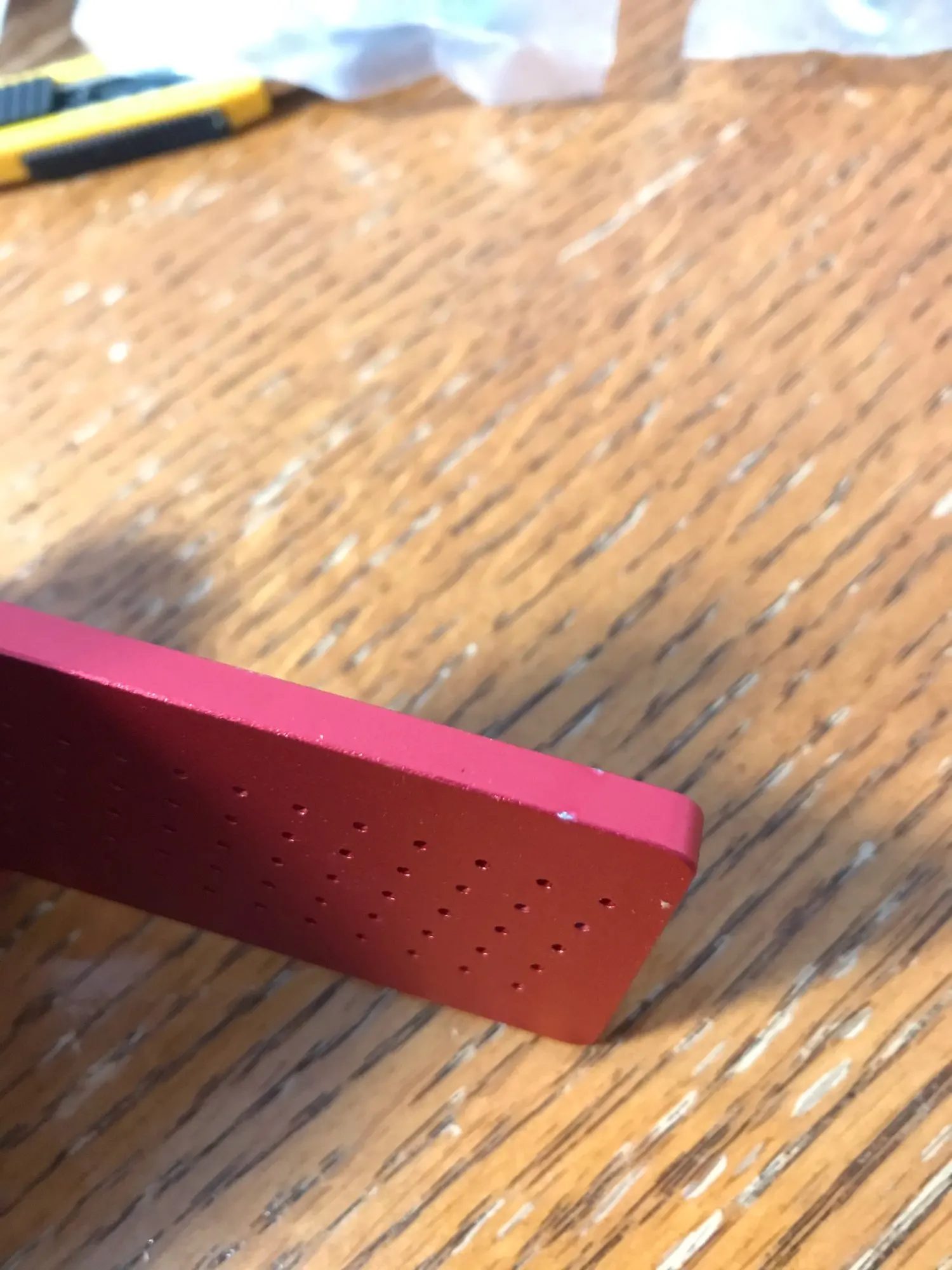Выглядит более розовато, чем красный. Просверленные отверстия кажутся полностью просверленными, но я должен был вычистить заусенцы в отверстия, чтобы карандаш прошел через них. Измерения выглядят точно. Только проблема была пара царапин.