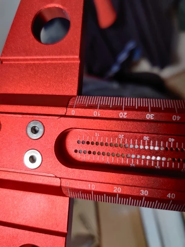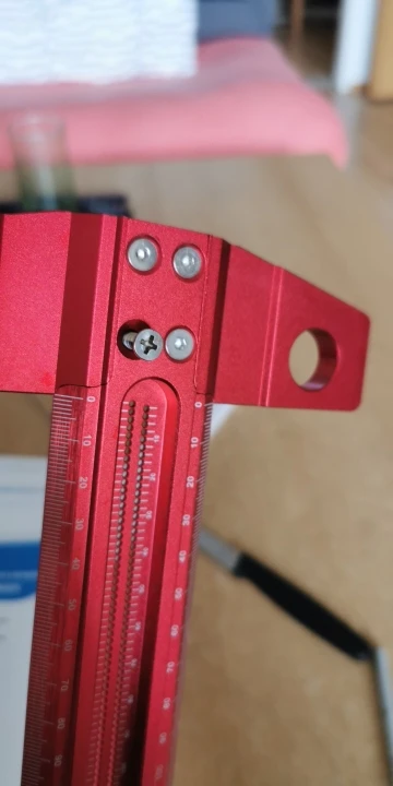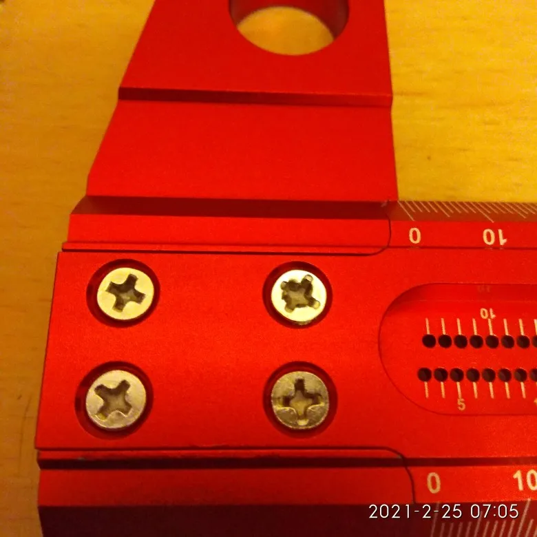 Сделан очень качественно.Правда разметочная шкала нанесенна краской и это считаю минусом. Неизвестно сколько продержится краска.Разметочные отверстия действительно 0,5мм. Маркер толщиной 0,5 только-только влезает. И да, пришёл угольник с вот такими варварски завинченными крепёжными винтами.