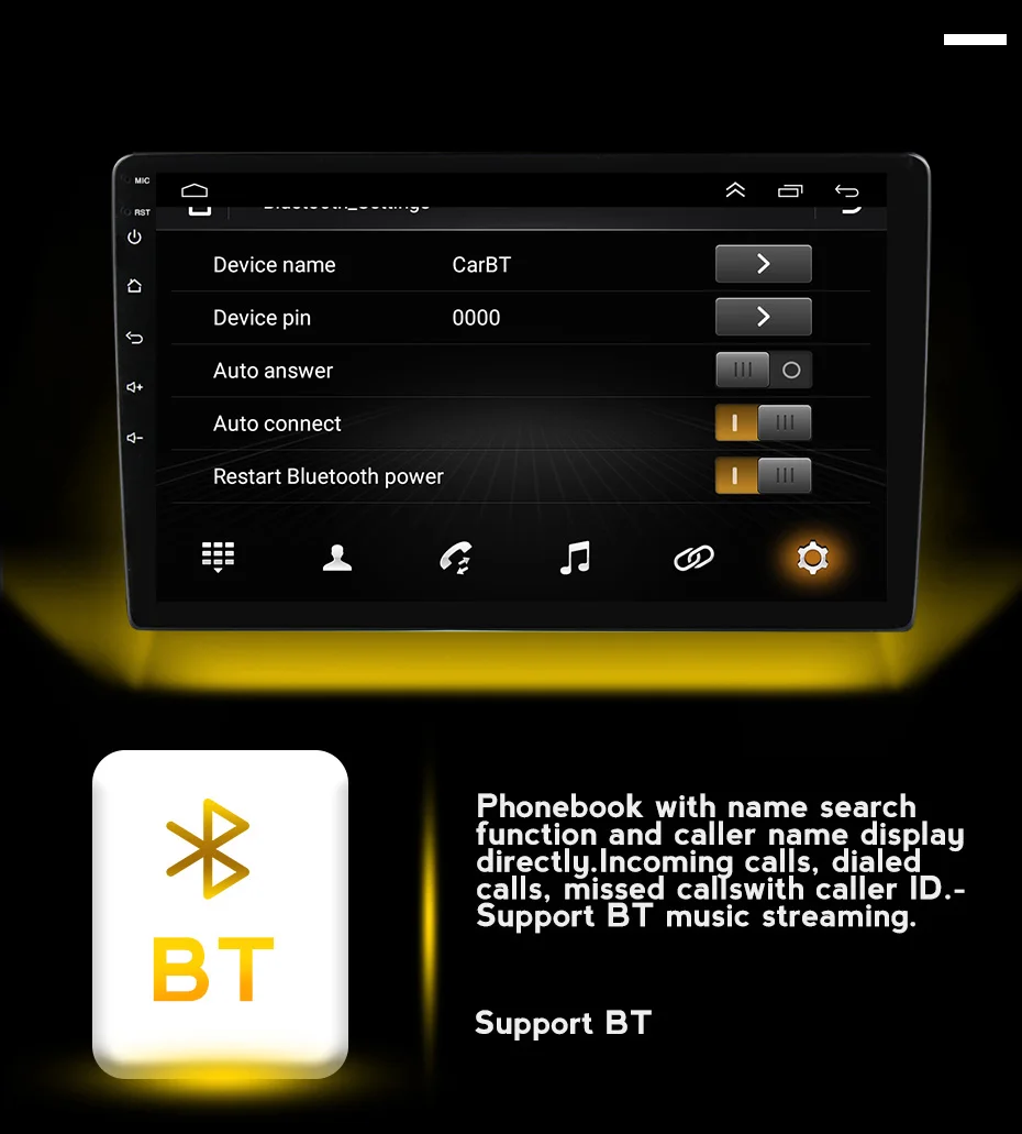 Телефонная книга с функцией поиска имени и отображением имени звонящего, входящих звонков, пропущенных вызовов с идентификатором звонящего. Поддержка потоковой передачи музыки BT.