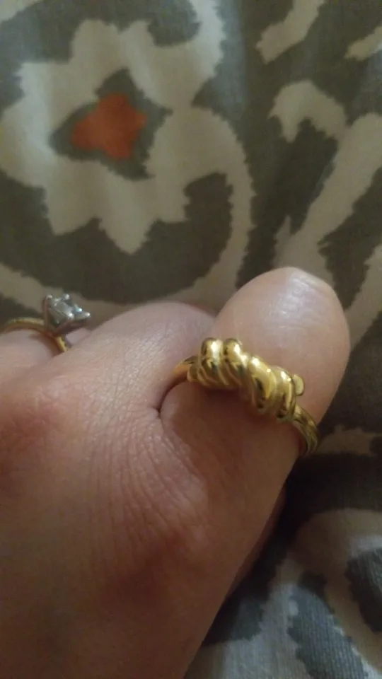 очень красивое, аккуратно сделанное кольцо. Стильное, не кричащее. Все соединения, изгибы хорошо зачищены, однородны, благодаря чему кольцо выглядит аккуратно, дороже своей стоимости. Цвет ближе к розовому золоту, чем к жёлтому, не кричащий, не смотрится как бижутерия. Пришло достаточно быстро, не смотря на период китайского нового года, отправлено было сразу в тот же день, через несколько часов после оплаты. Очень аккуратно упаковано в коробочку с уплотнением. Рекомендую этот товар и продавца - продавец очень ответственный, чётко исполняет свою работу, ассортимент в магазине очень разнообразный по стилю, но неизменно высокого качества.