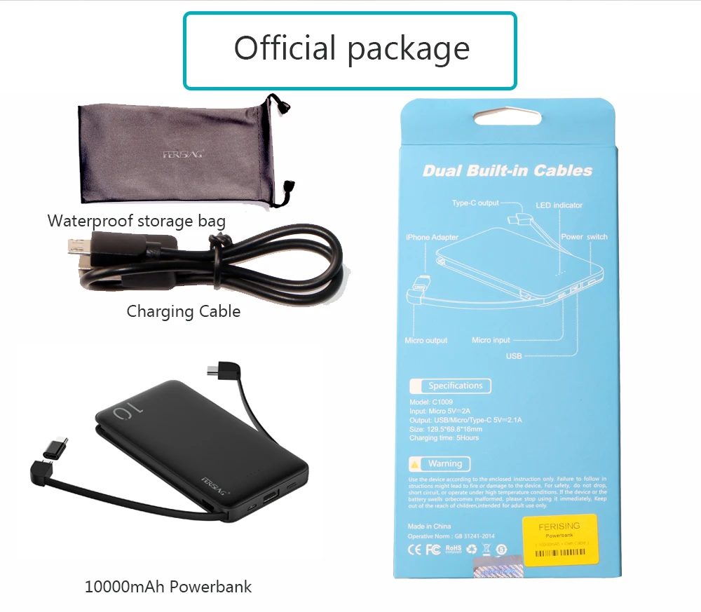 FERISING 10000mah Powerbank * 1 + Micro USB кабель * 1 + розничная посылка * 1 + водонепроницаемая сумка * 1