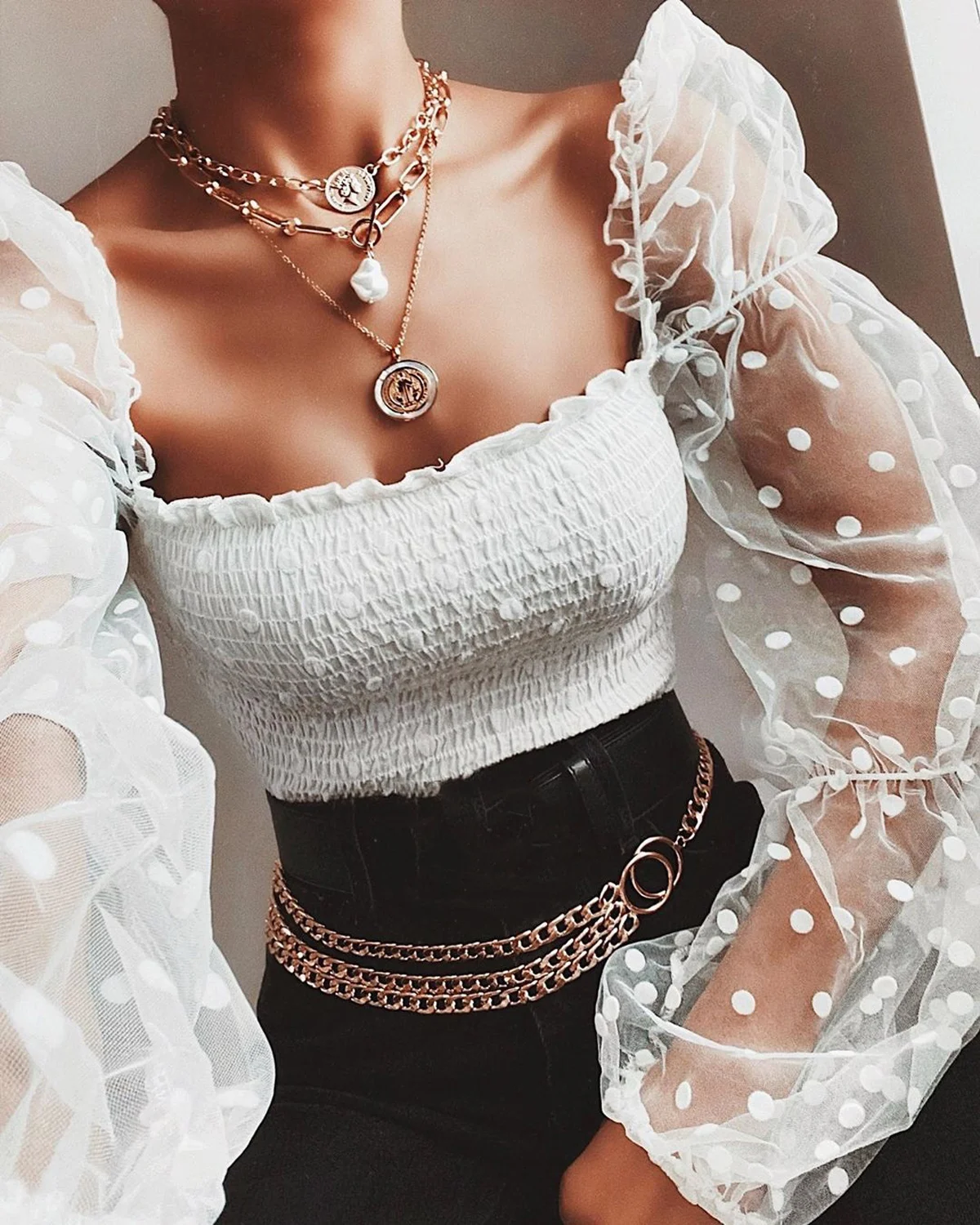 Блузка женская с открытой спиной, пикантная сетчатая Полупрозрачная блузка с пышными рукавами и запахом на груди, топ в горошек, весна-лето 2020