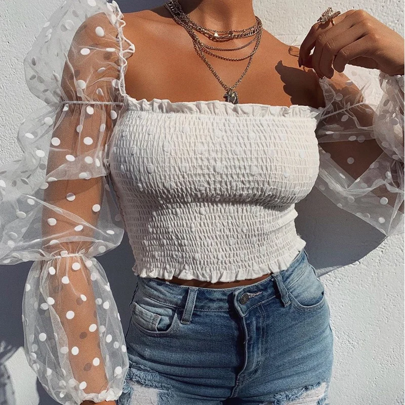 Сексуальная Женская кружевная прозрачная блузка в горошек с квадрат...