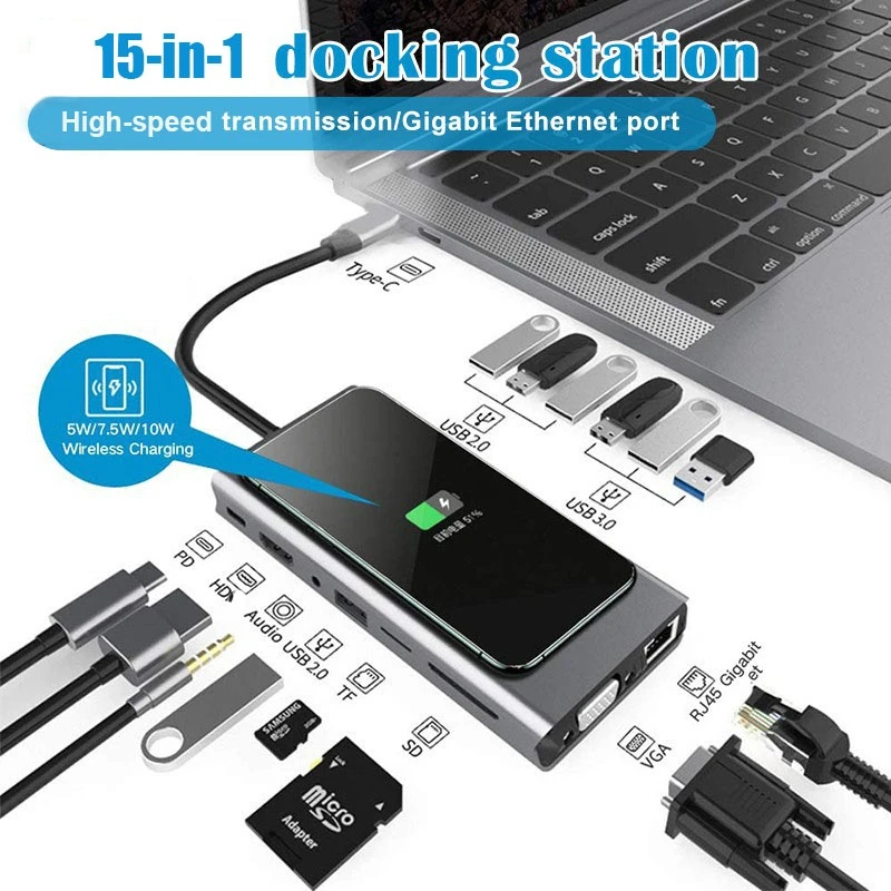 USB C концентратор док-станция для ноутбука мультипорт PD VGA HDMI-совместимый USB 3,0 2,0 концентратор беспроводной зарядки TF SD ридер RJ45 для mac book