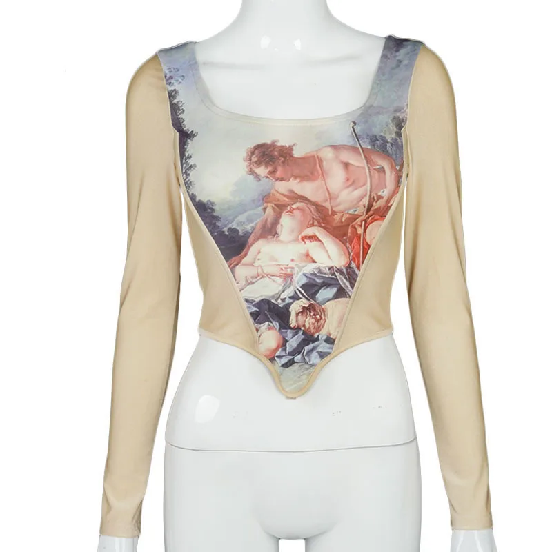 Укороченный Женский корсет с длинным рукавом и винтажным принтом