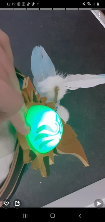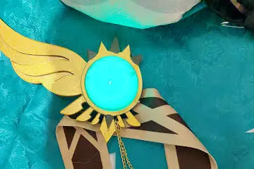 Great cosplay, I'm very satisfied but I recommend to get bigger sizes with cosplays, because the size usually fits quite small compared to clothes, I usually wear Xs clothes, but L with cosplays, I loved everything about it again the cosplay and the charm for around the belt is made of wood, it gives off light but i don't know if you can charge it. If I were you you would just buy it, but pay attention to the sizing