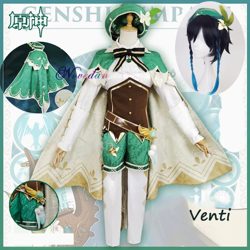 Костюм для косплея геншина ударного из аниме, костюм Венти для вечеринки с париком для взрослых женщин, одежда для Хэллоуина, карнавала