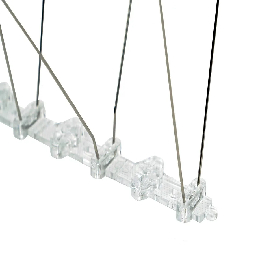 Одно из немногих средств, которое полностью исключает присутствие птиц на защищаемом объекте. Обеспечивает физическую преграду к месту посадки, которые птицы размером от воробья до ворона неспособны преодолеть. Длина секции составляет 50 см. Каждая секция, выполненная из специального поликарбонатного пластика. Изделие содержит 20 стальных шипов двух размеров, образующих 4 ряда. Металлические шипы изготовлены из пружиннойнержавеющей проволоки 1.3 мм., направленны в разные стороны и не позволяют птицам совершить посадку на защищаемую поверхность – подоконник, карниз, заградительные перила, декоративные украшения фасада зданий, трубы коммуникаций, памятники и прочие поверхности, обычно используемые птицами в качестве присад. Материалы изделия обеспечивают длительную службу в погодных условиях регионов России и не нуждаются в профилактике и ремонте. В случае форс-мажорных обстоятельств (падение на шипы тяжелых предметов, таких как глыб льда) ремонт легко провести самостоятельно, заменой поврежденных шипов либо целых секций. Конструкция шипов «Ёж-пазл 10» позволяет легко устанавливать и заменять отдельные элементы (шипы) либо целые секции.