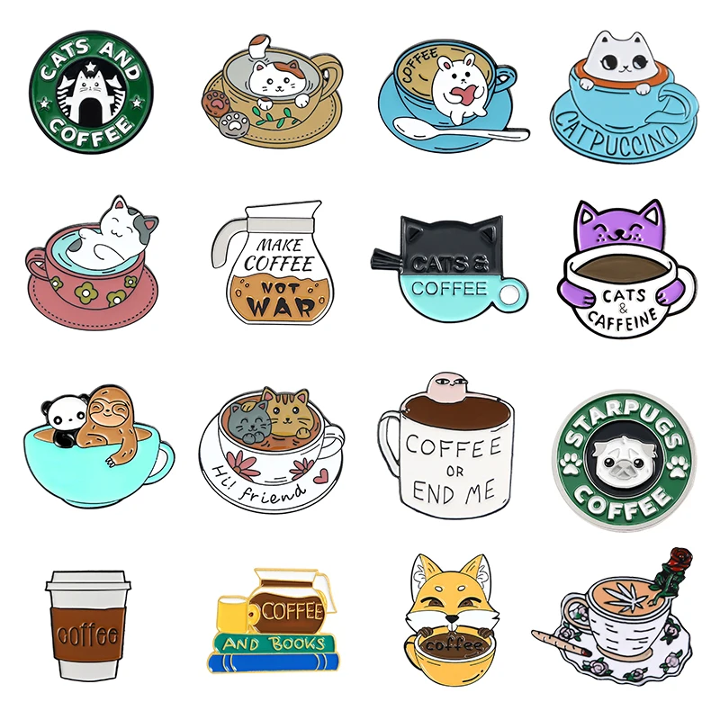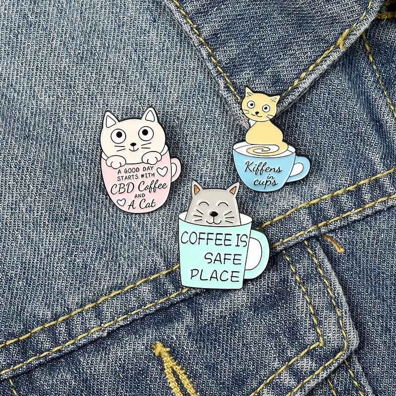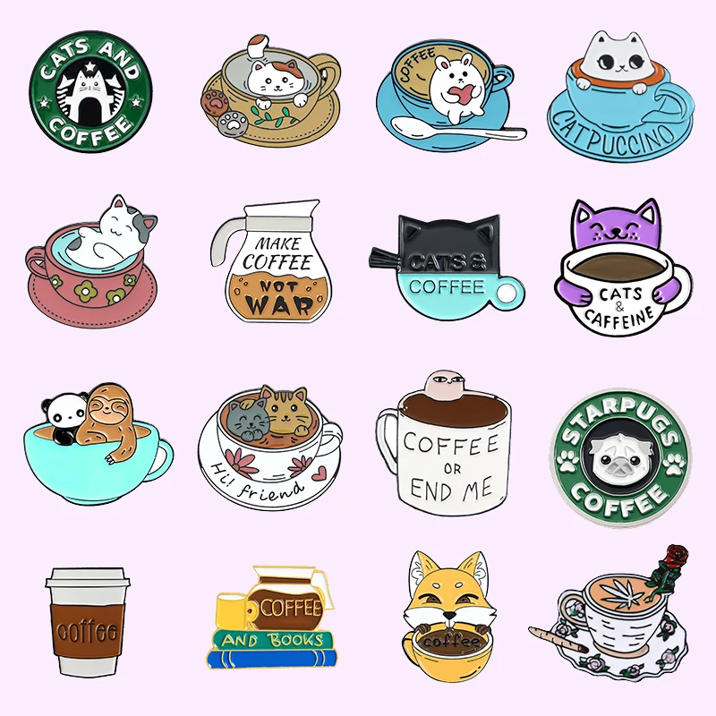 Броши на лацкан в форме кошек, с мягкой эмалью, тематическая серия кофе, значки с героями мультфильмов