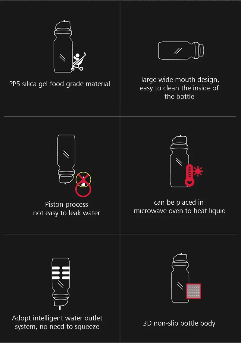 1) не нужно сжимать. Умная Система рта2) пищевой силикон + PP5. Материалы для обеспечения безопасности и защиты окружающей среды3) герметичное сопло поршневого типа (пневматический патент)4) высокая термостойкость. Можно разместить в микроволновой печи5) широкий рот (легко установить воду, легко чистить)6) трехмерный дизайн поверхности корпуса бутылки. Почувствуйте себя лучше!