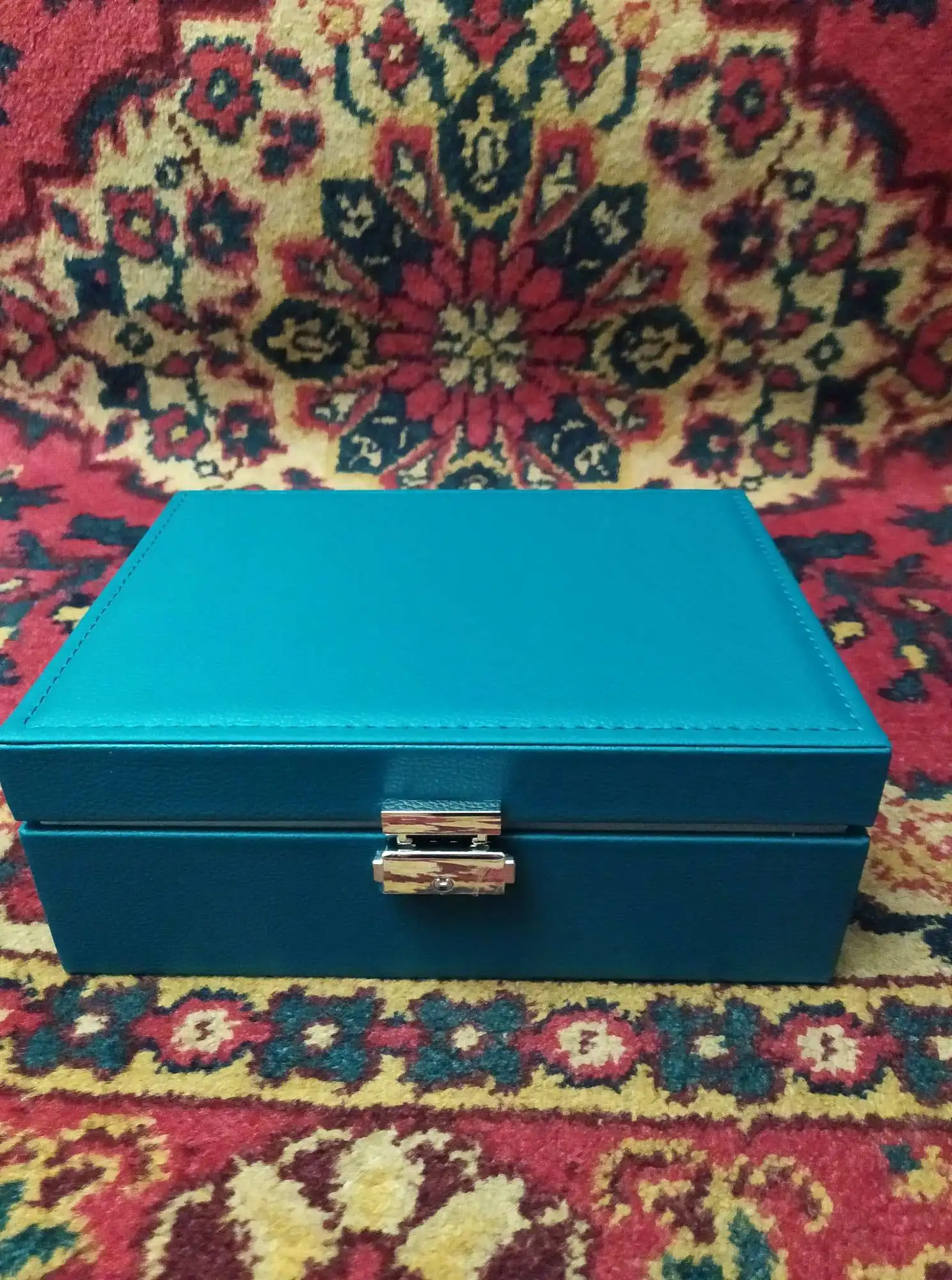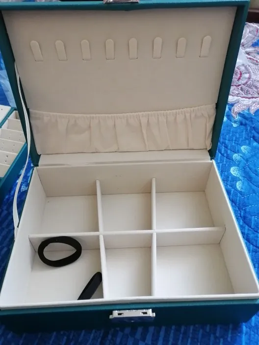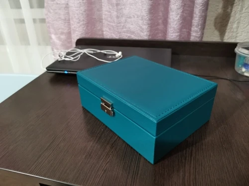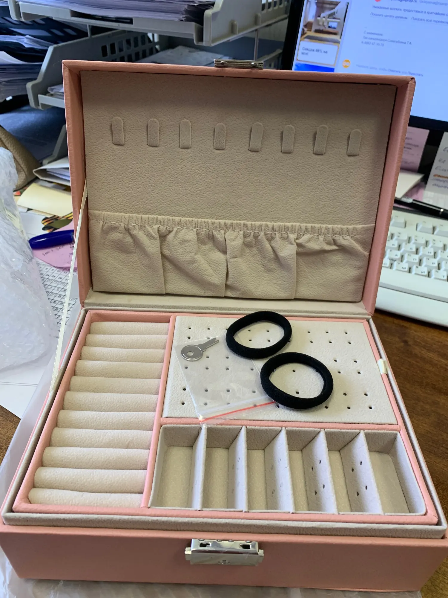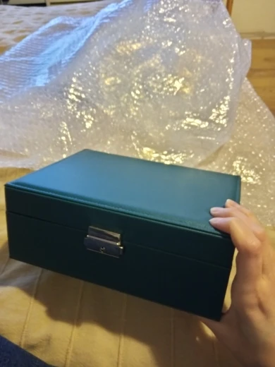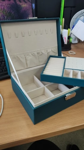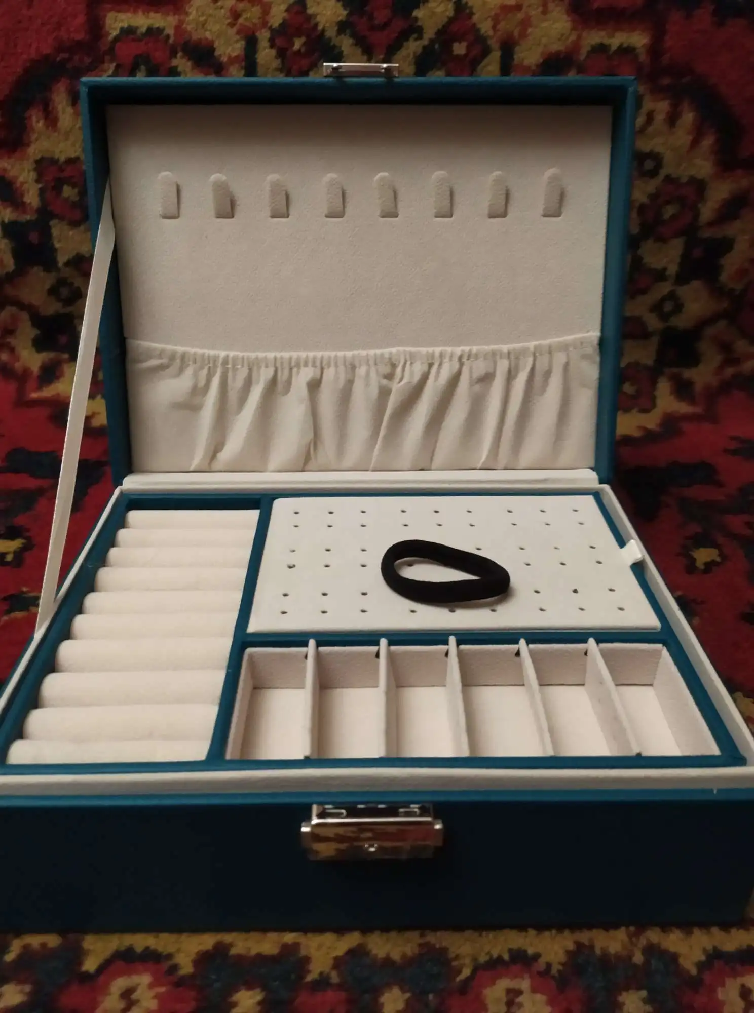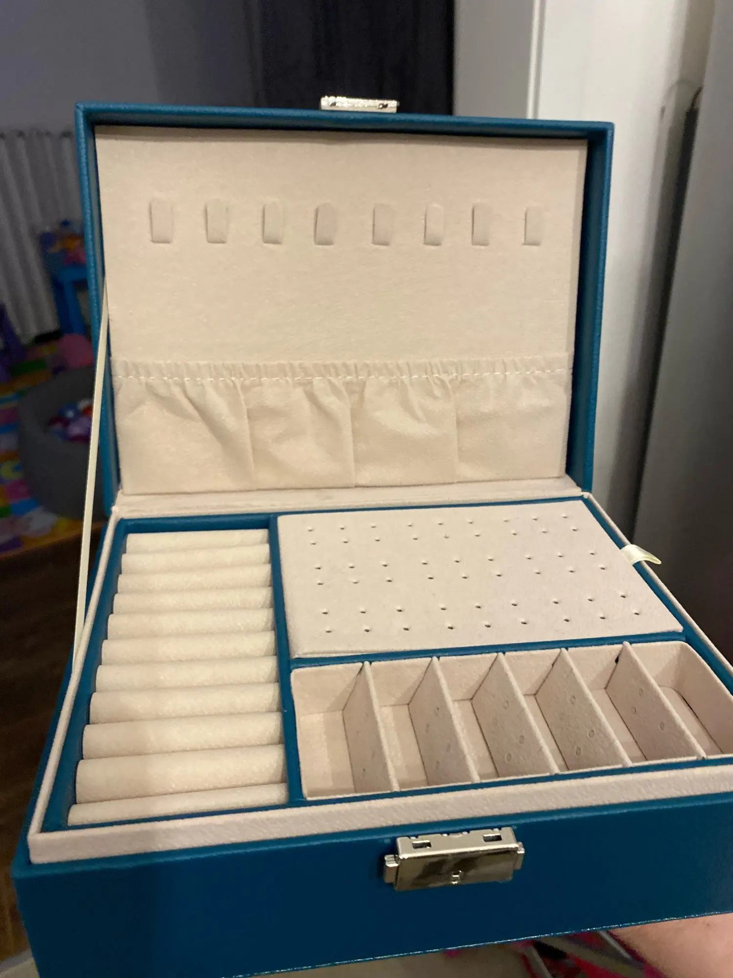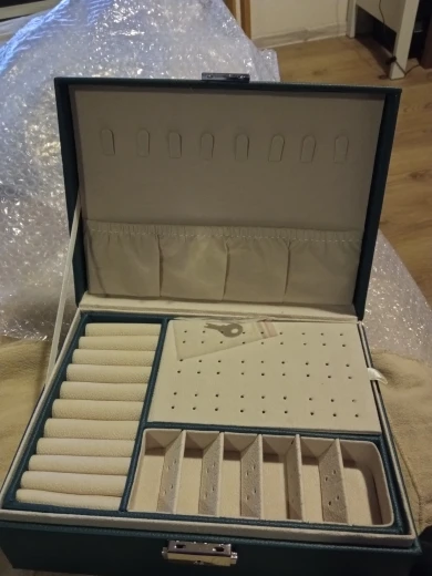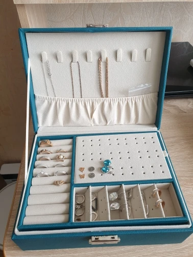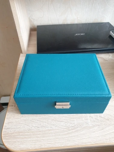 Очень хорошая шкатулка, вместительная. Качественно сделана. все разложилось по местам. Сначала был небольшой запах, но через 2 дня все выветрилось. Я довольна покупкой. Заказывала зелёный цвет, в итоге он оказался сине-зеленым, но красивый цвет. Продавец в виде подарка положил две резиночки для волос, спасибо ему за это.