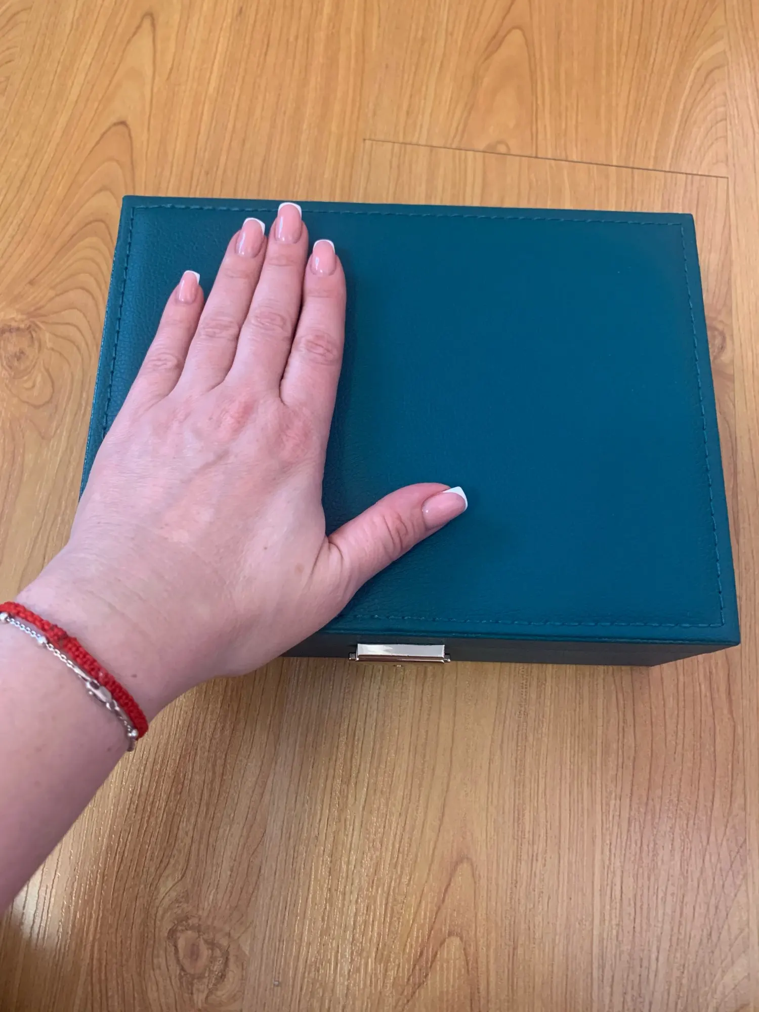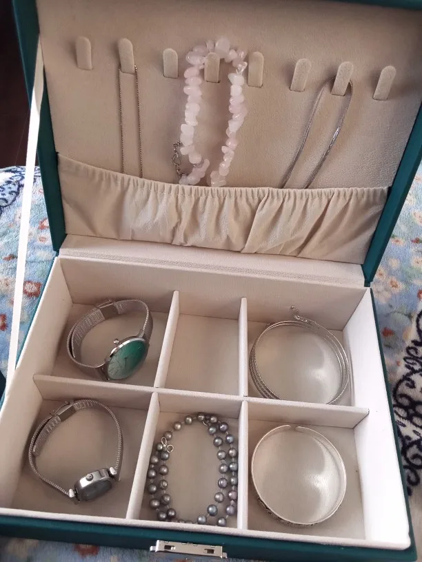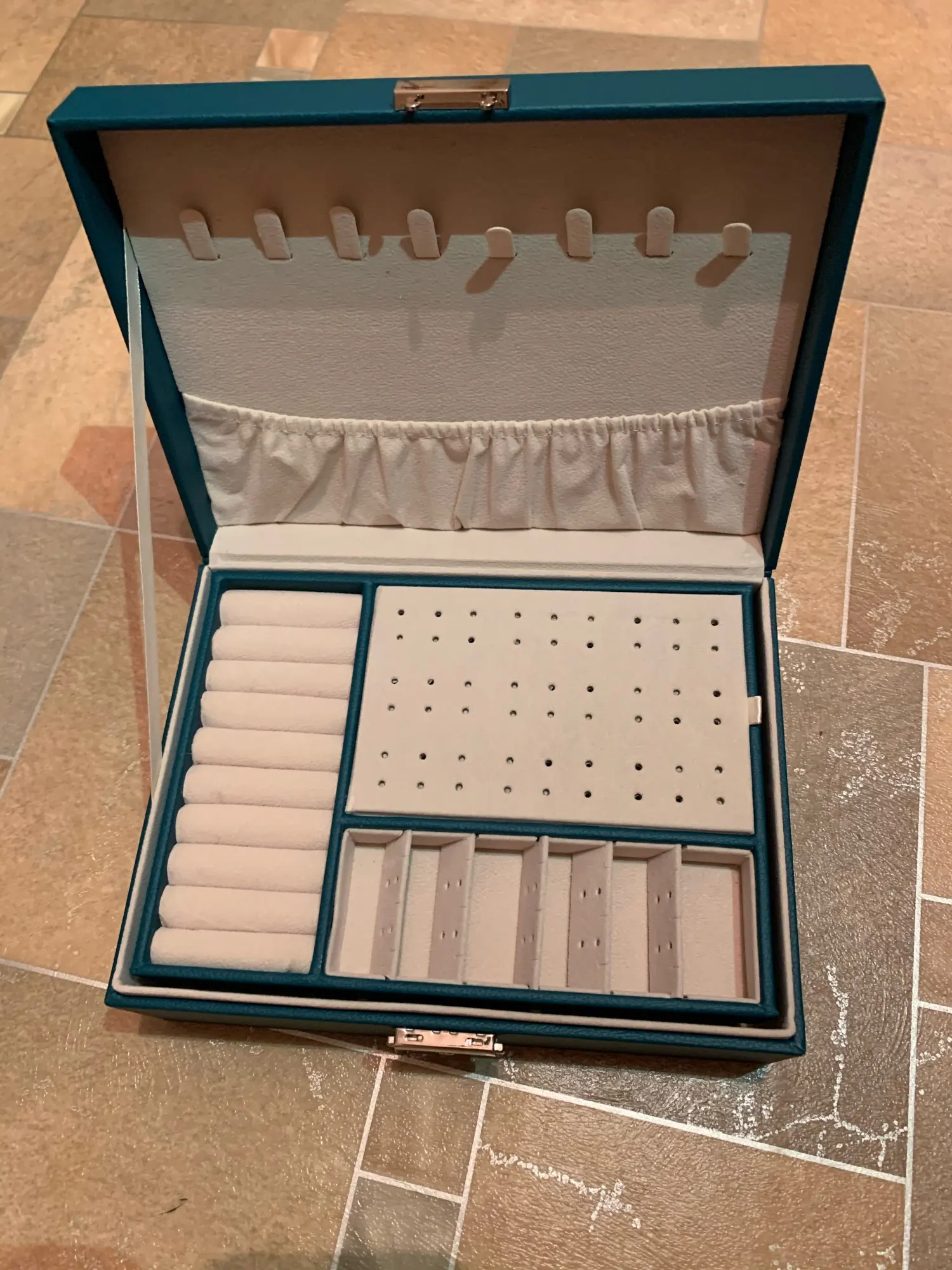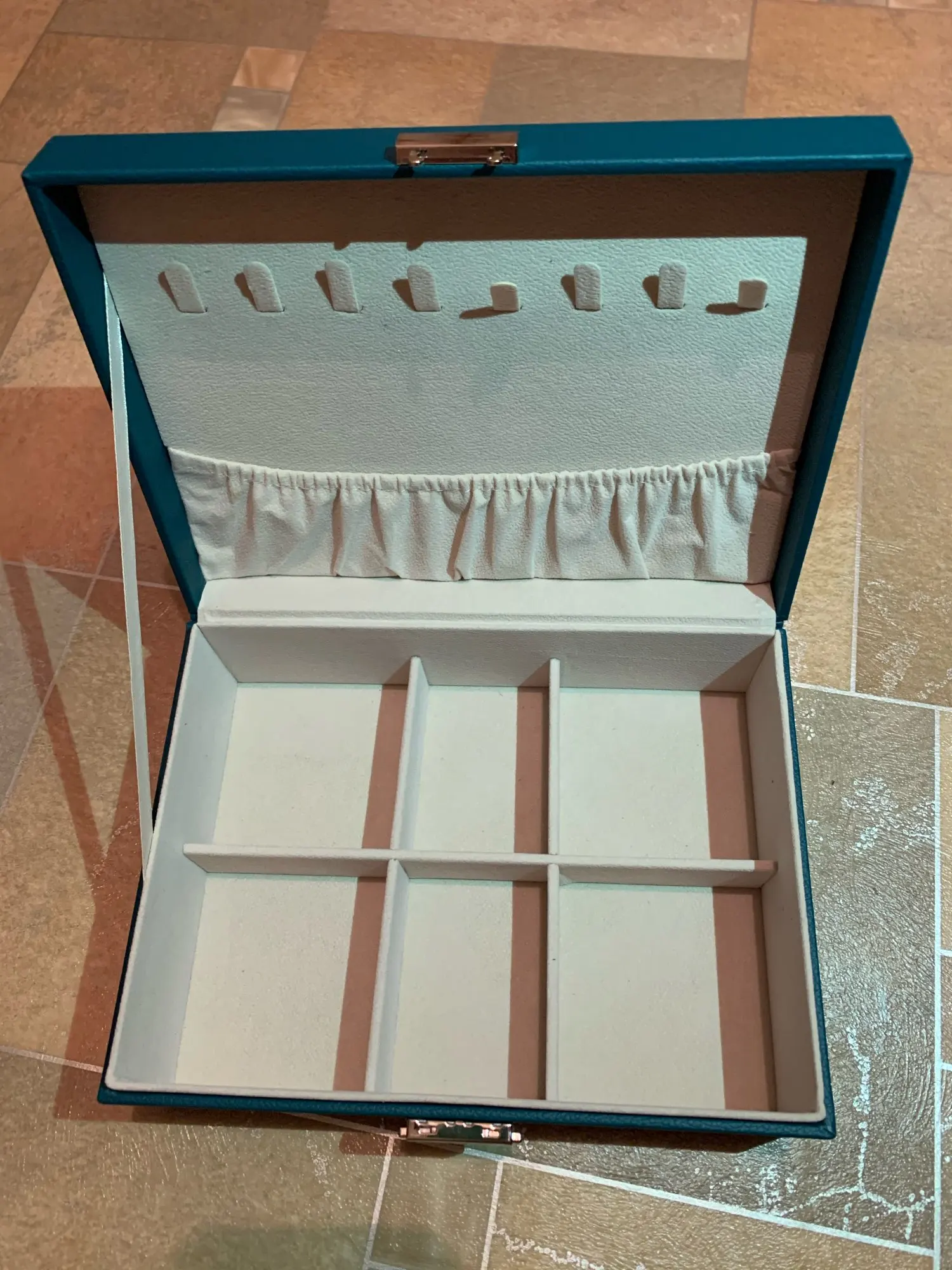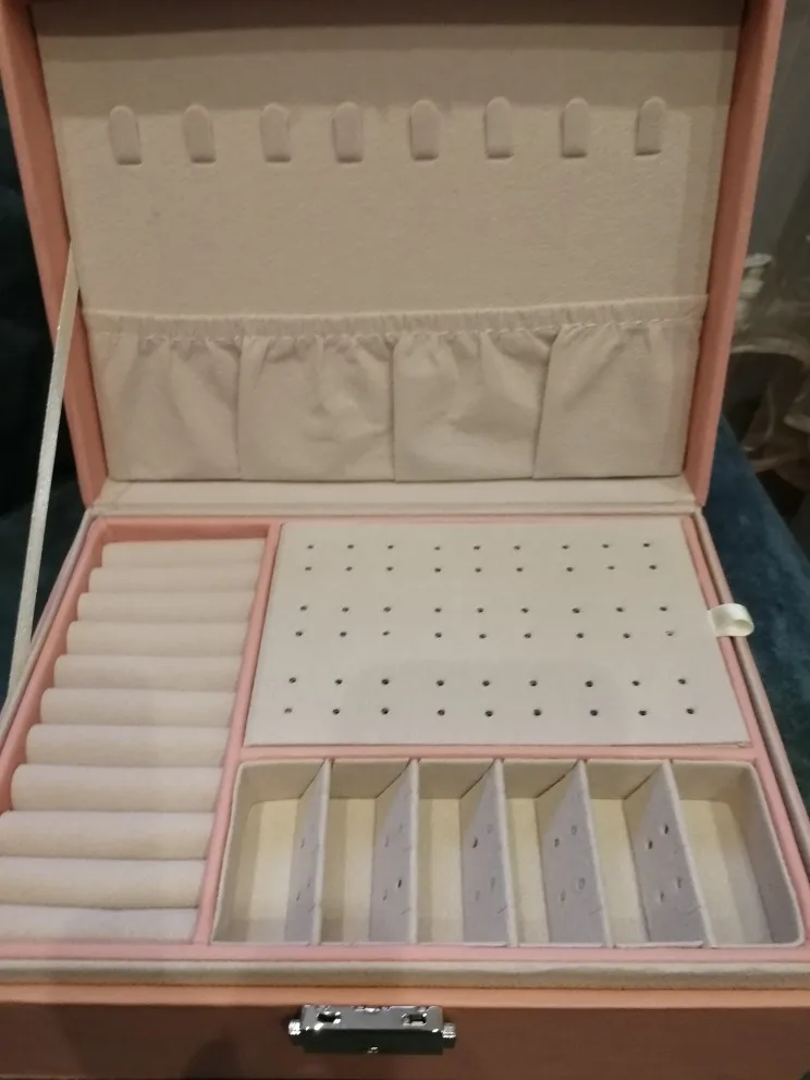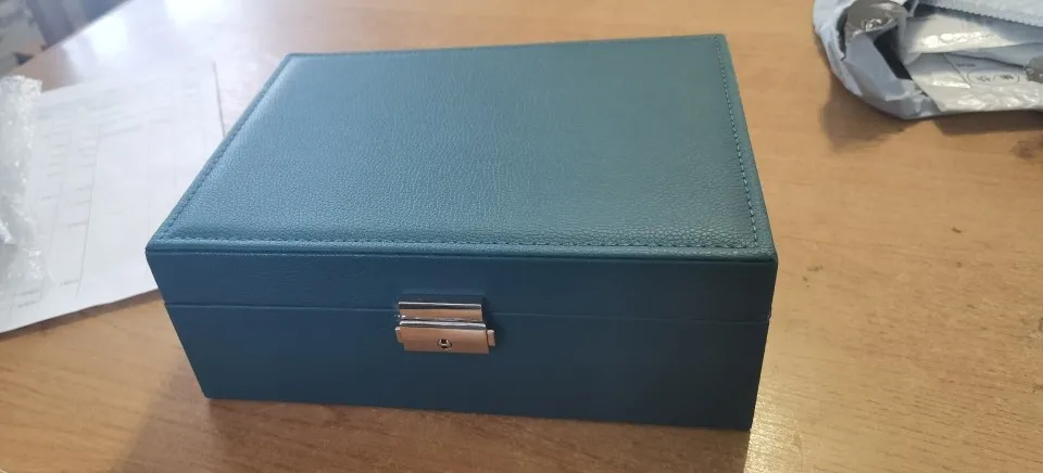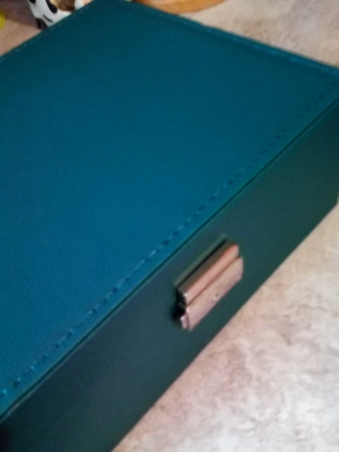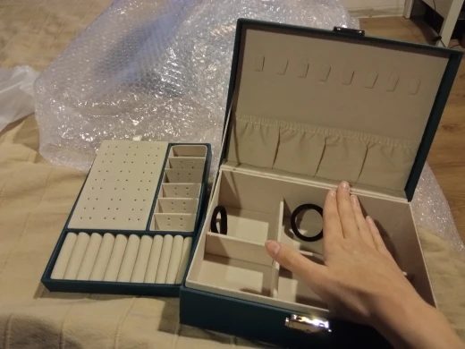 Очень хорошая шкатулка, вместительная. Качественно сделана. все разложилось по местам. Сначала был небольшой запах, но через 2 дня все выветрилось. Я довольна покупкой. Заказывала зелёный цвет, в итоге он оказался сине-зеленым, но красивый цвет. Продавец в виде подарка положил две резиночки для волос, спасибо ему за это.