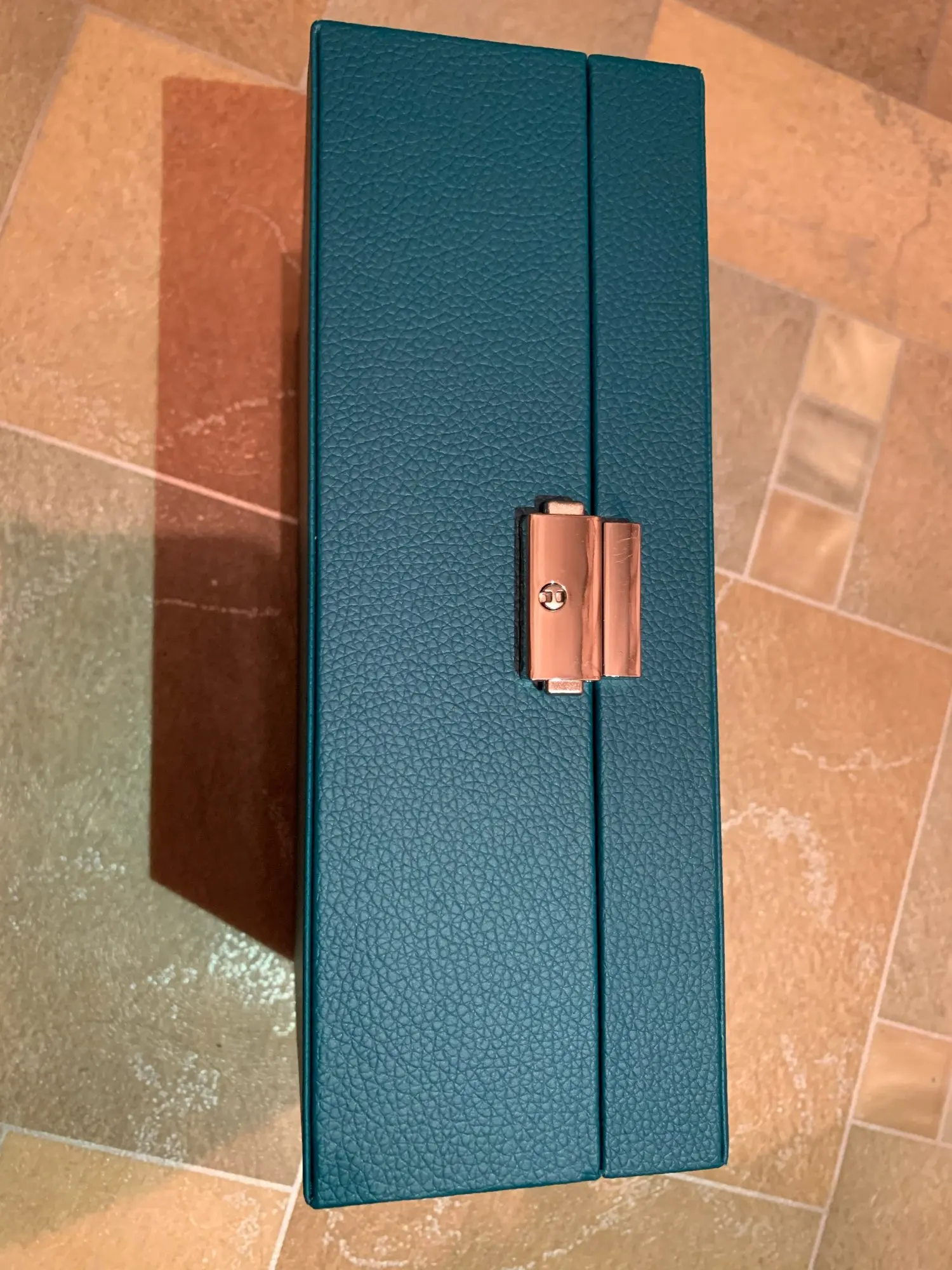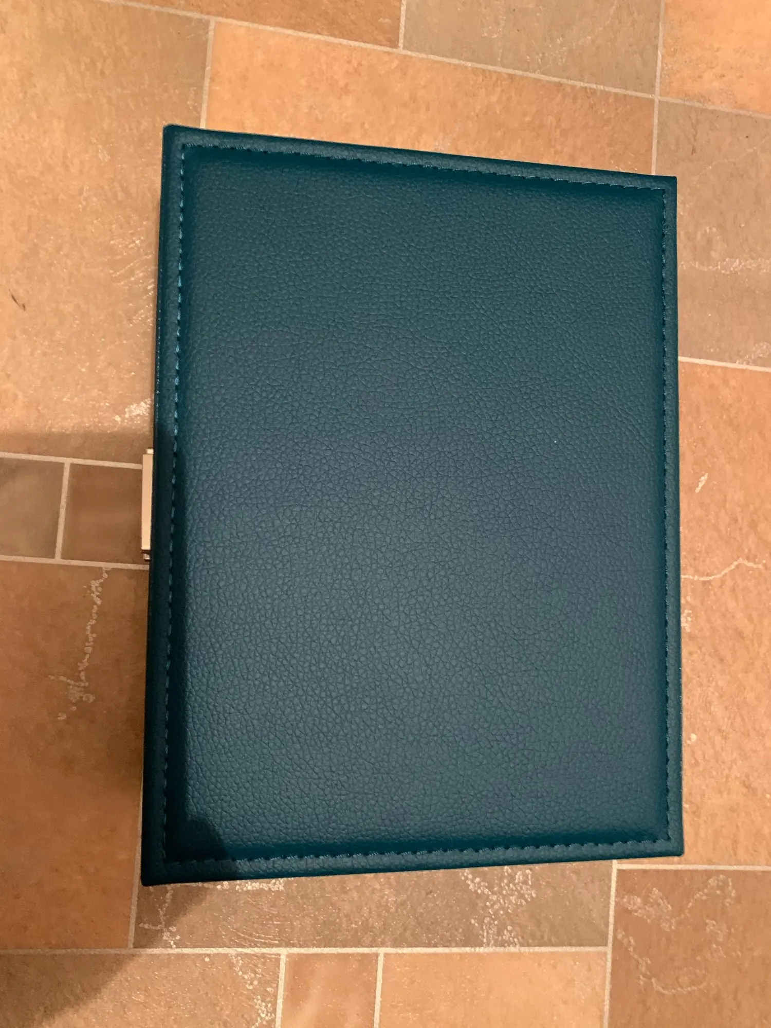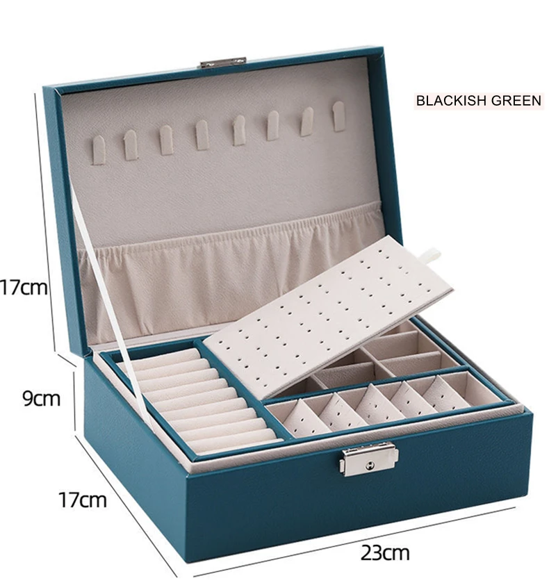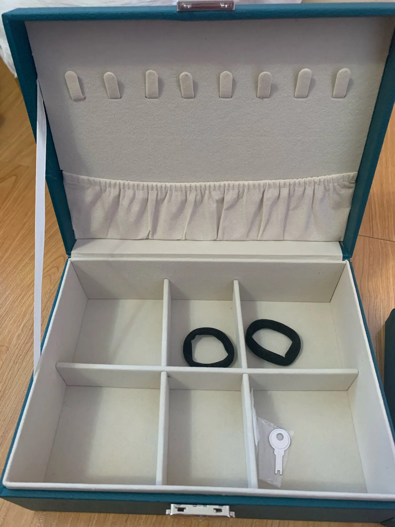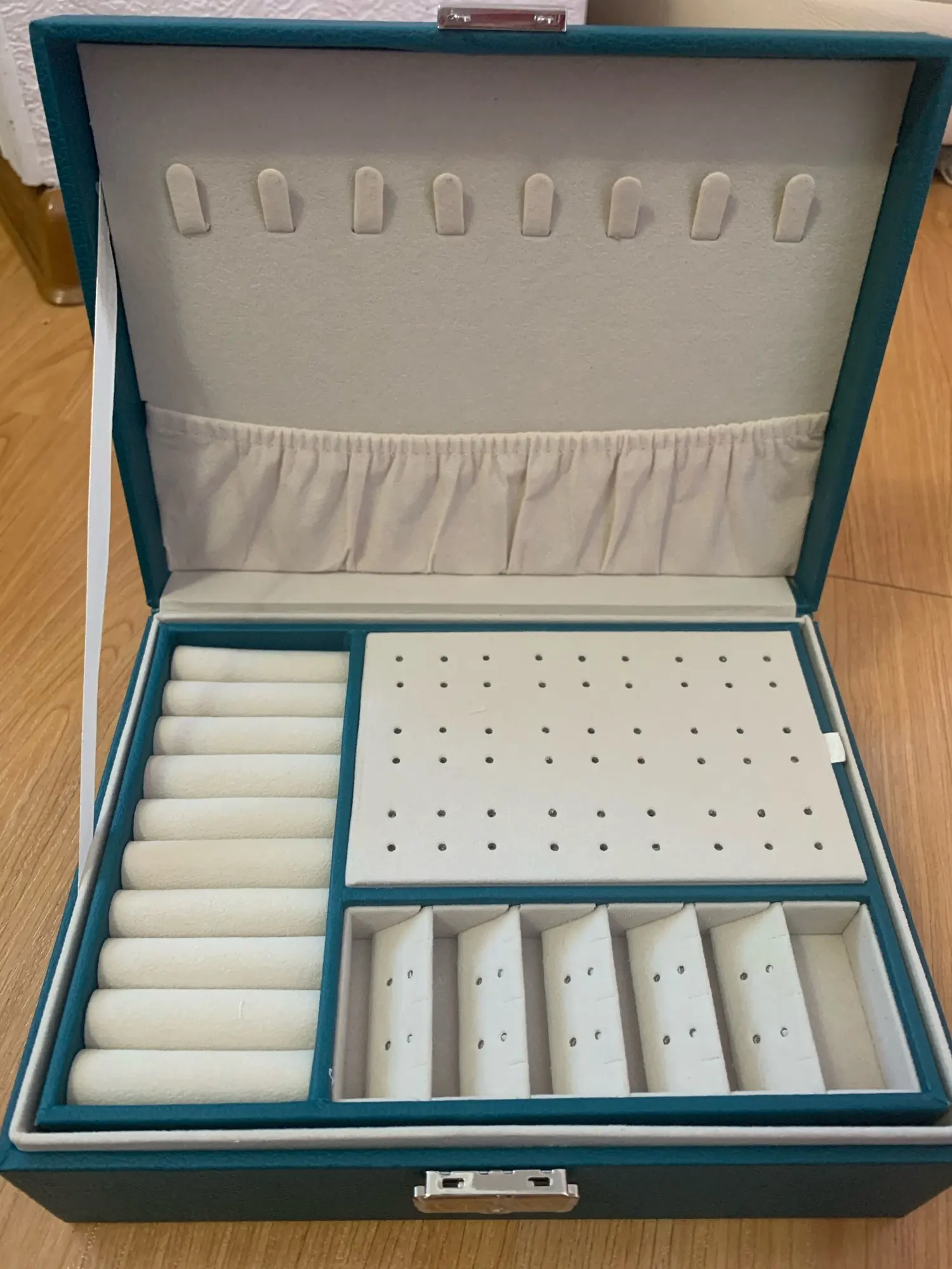 Очень хорошая шкатулка, вместительная. Качественно сделана. все разложилось по местам. Сначала был небольшой запах, но через 2 дня все выветрилось. Я довольна покупкой. Заказывала зелёный цвет, в итоге он оказался сине-зеленым, но красивый цвет. Продавец в виде подарка положил две резиночки для волос, спасибо ему за это.