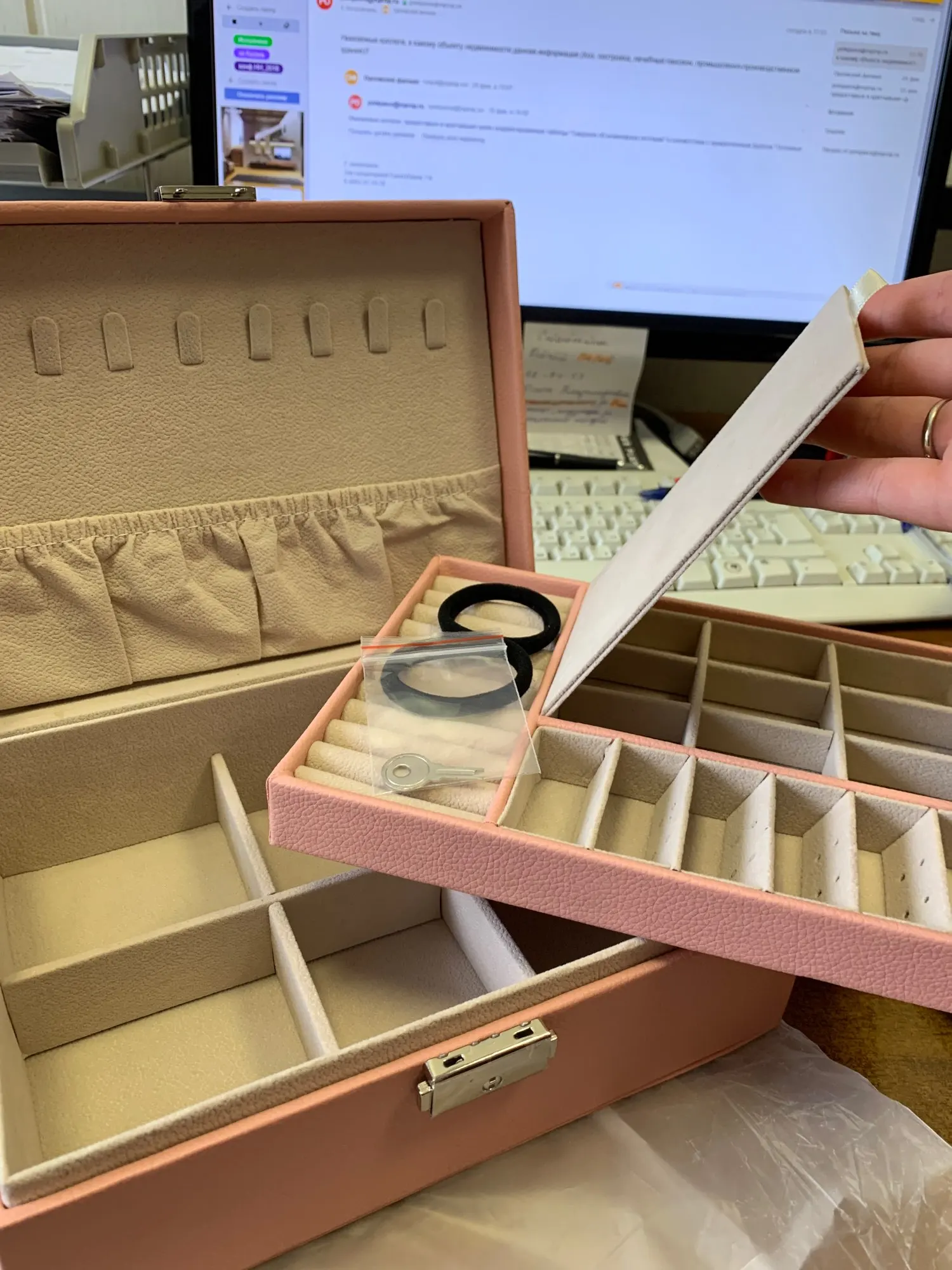 Шкатулка просто чудесная! Приехала аккуратно упакованная, ничего не помялось. При распаковке был запах, будто она только что с конвейера, но быстро выветрился. На замке была защитная пленка, в комплекте ключик. Очень вместительная, много отсеков под все виды украшений.