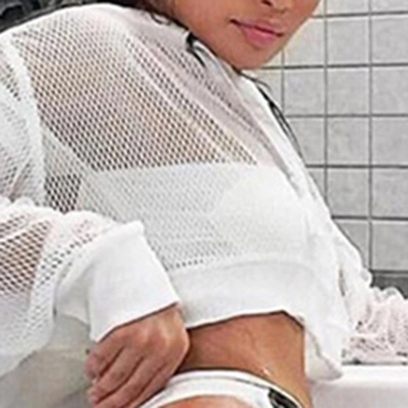 Футболка женская сетчатая с длинным рукавом, прозрачная пикантная короткая рубашка с капюшоном, черный ажурный топ, осень