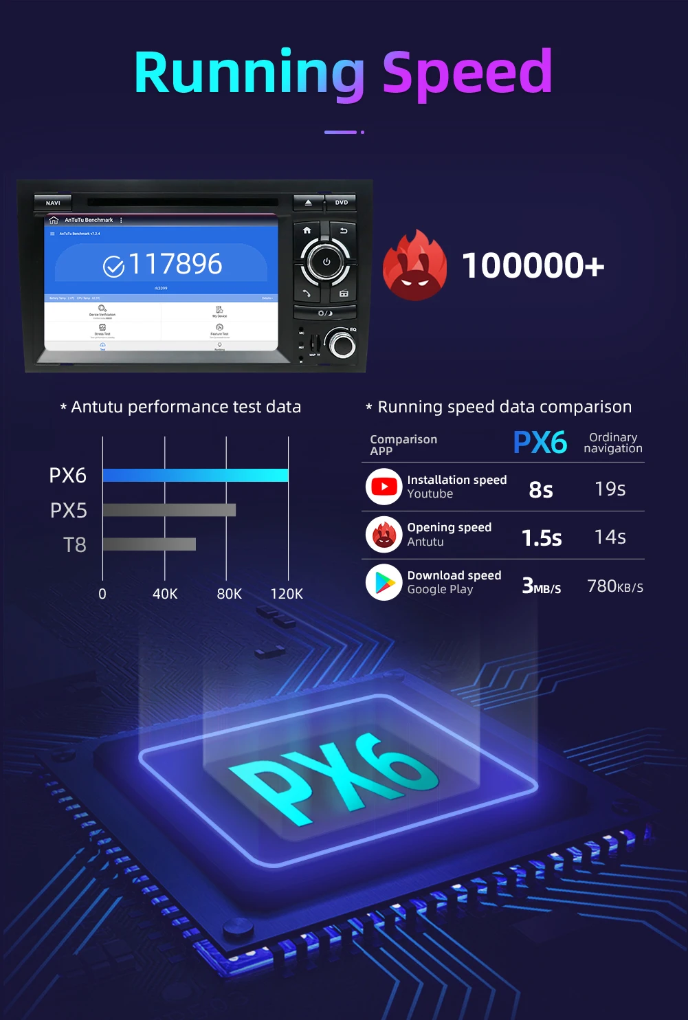 7 дюймов Android 10,0 + емкостный Экран + 1024*600 + Octa Core RK3399 2,0 ГГц Процессор + DDR3 4 Гб флэш-памяти + 64 Гб памятиPX6 Cortex A72 + A53Выходная мощность: 4*45 ВтBluetooth 5,0, радио IC TDA 7786. Усилитель 7851Рабочая температура-20 ℃-+ 70 ℃Видео: поддержка 1080P,AUX IN, RCA выход