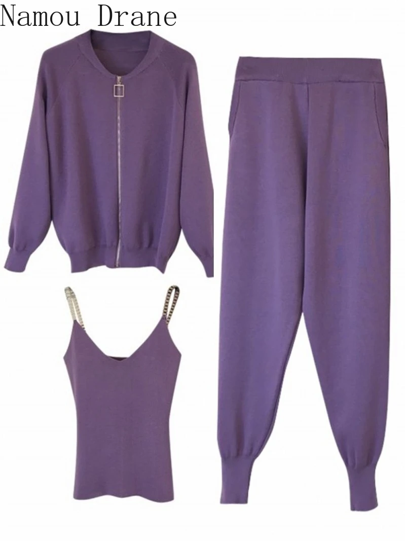 Модный женский костюм, Новинка осени 2020, повседневный милый темпераментный жилет с цепочкой, вязаная куртка + эластичные брюки-тройки
