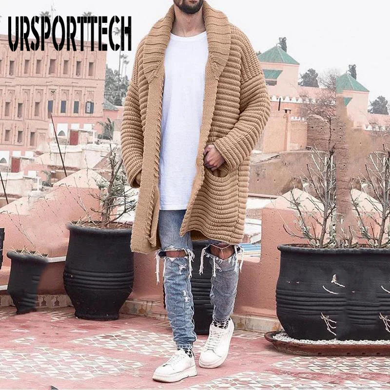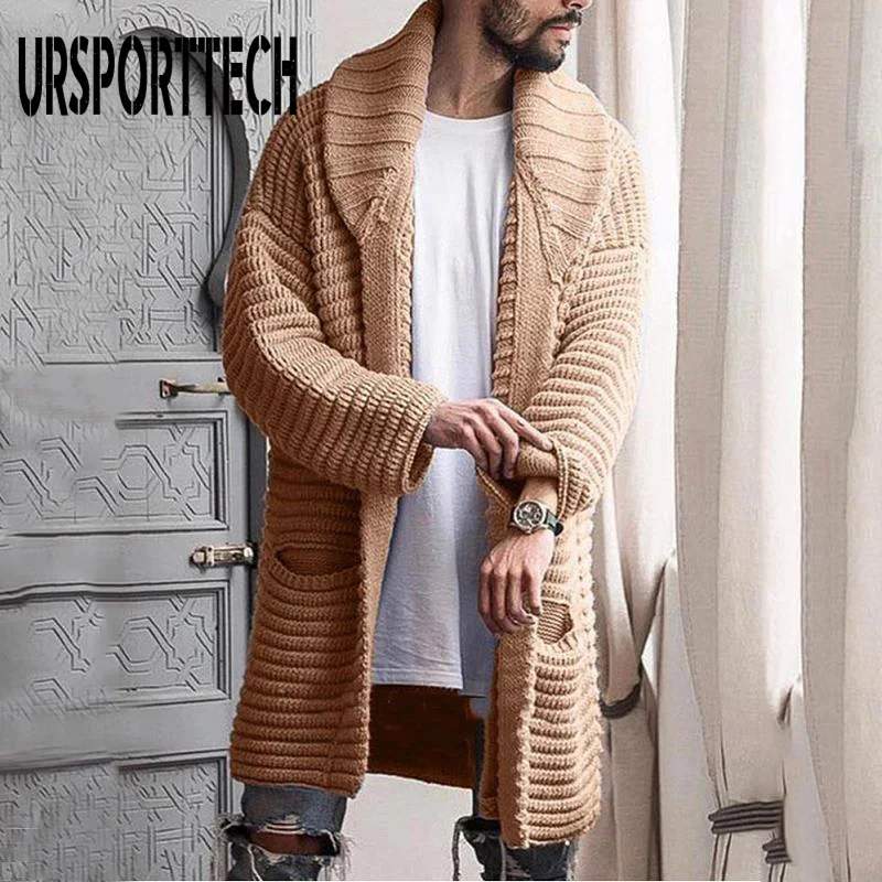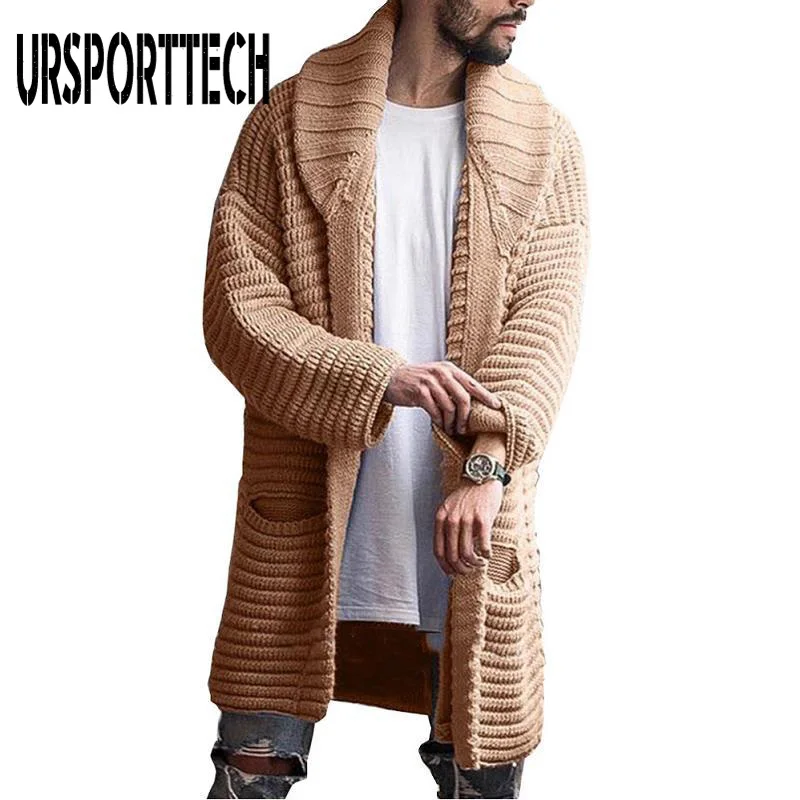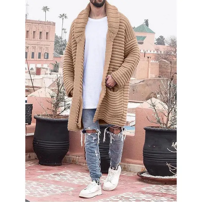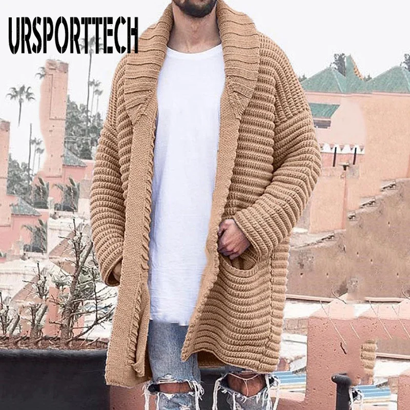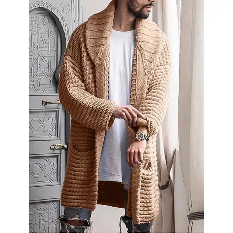 Кардиган мужской осенне-зимний, плотный, теплый, однотонный, с длинными рукавами, лацканами и карманами, свитер, пальто, вязаное