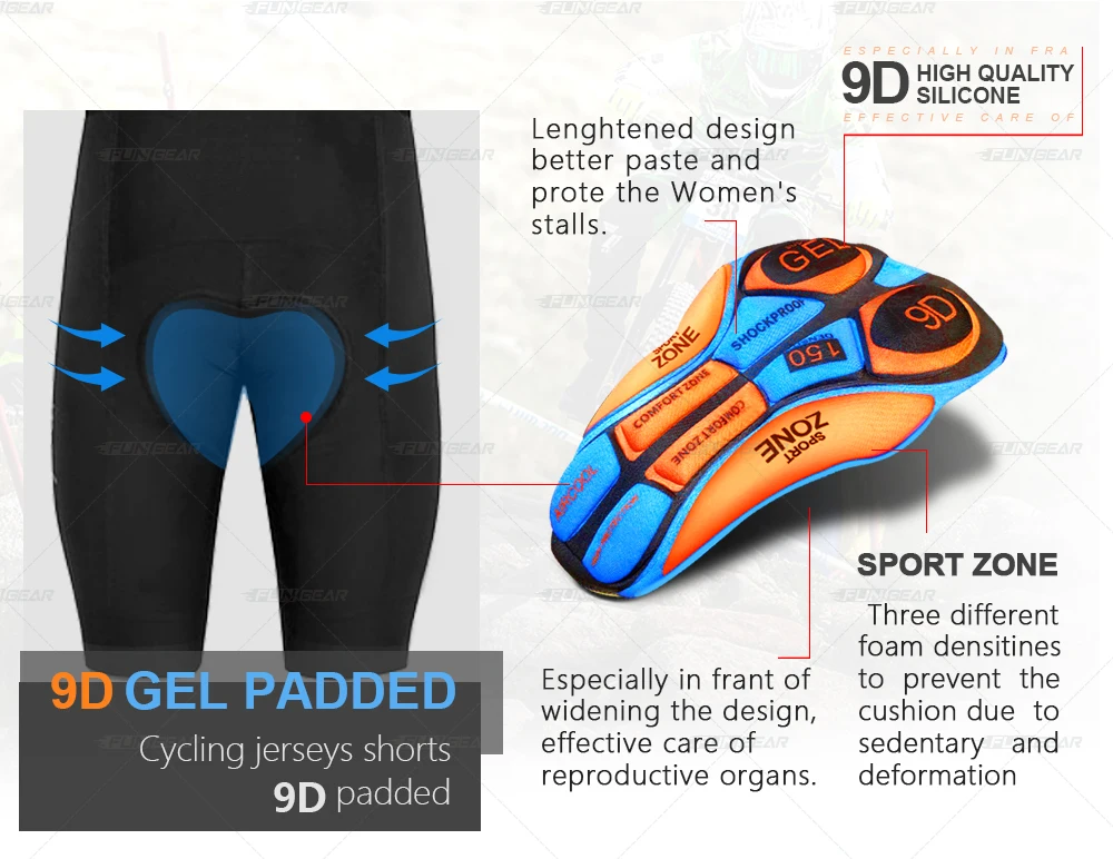 Джерси: 100% полиэстер брюки: 20% полиэстер и 80% лайкра Подкладка: бренд 9D гелевая подкладка Функция: дышащий/быстросохнущий/УФ-защита/компрессия
