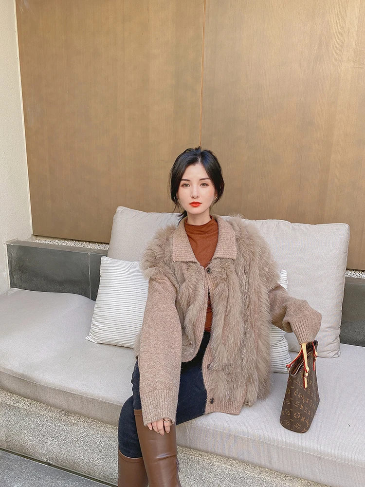 Французское популярное женское вязаное кашемировое пальто из лисьего меха, средней длины, свитер, кардиган, пальто из натурального меха, F1024-5