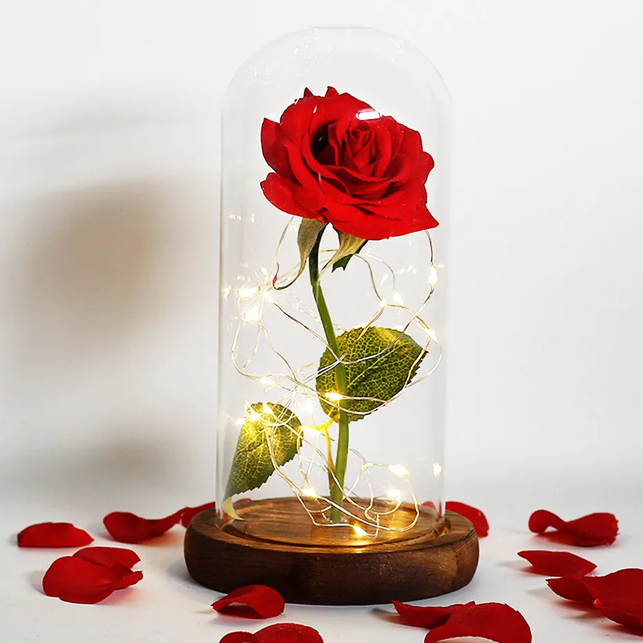 2021 дропшиппинг Красота и с рисунком из мультфильма Красавица и Чудовище в виде красных роз в Стекло купол с светодиодный светильник с деревянной основой для Святого Валентина День матери Подарки