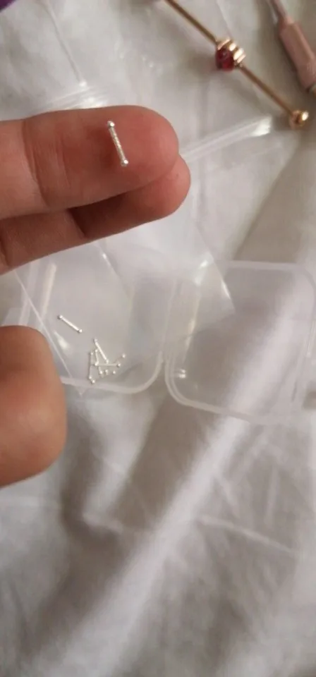 Они намного меньше, чем я представила, но так даже лучше. Очень классные! Шарик не снимается - штанга проходит через мочку насквозь. Спать удобно, не мешают, не выпадают. Одна единица товара - это 8 маленьких штанг. Приехали на почту в Мск быстро. Упакованы хорошо. Трек отслеживался. С продавцом не общалась.