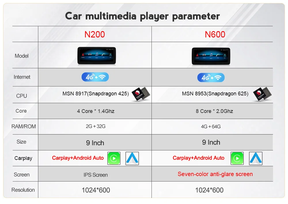Хорошие новости: Новый запуск, N200 / N600 встроенный Carplay, Android 10,0 система, поддержка 4G LTE интернетN600's, 9 дюймов, док-станция Qualcomm Snapdragon 625 процессор, octa-core 2,0 ГГц, высокая производительность, подключи и играй, легкая установка, и Лидер продаж. Классный дизайн!